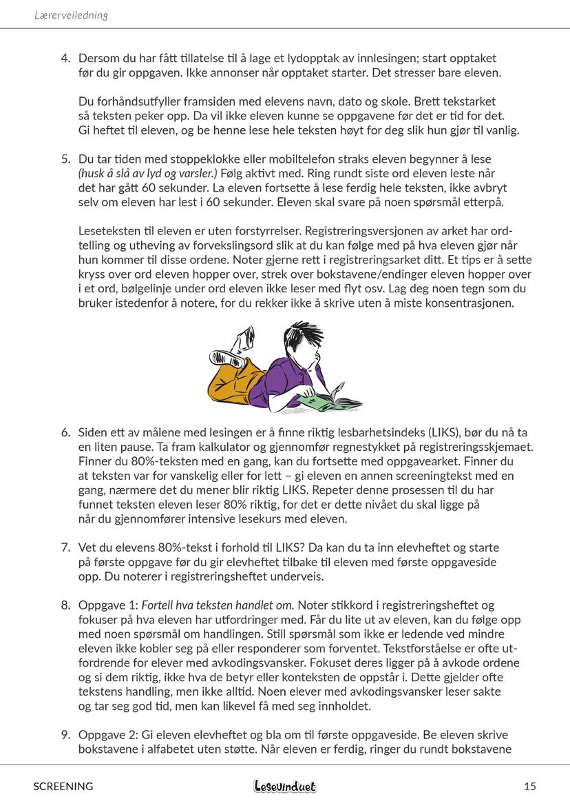 Elevheftene består av en forside, tekstside og to oppgavesider, og du finner seks tester med ulike LIKS-nivåer. Registreringsheftene består av et screeningskjema, tekstside som har ordtelling med utheving av tekstens forvekslingsord, og to oppgavesider med støtte og plass til notater. Dersom det er behov for å notere mer underveis bruker du notatarket som er vedlagt som kopieringsoriginal. Alfabetark til oppgave 2 finner du også vedlagt. På første side i registreringsheftet er screeningskjemaet. Her skriver du til slutt en vurdering av elevens hovedutfordringer. Trengs det en mer utfyllende vurdering, skriver du et enkelt vedlegg. NB! Med screeningen skal du finne elevens hovedutfordringer og ikke få en komplett analyse. Du skal finne elevens nærmeste utviklingssone i lesing og 80%-tekst, og hva eleven bør jobbe med. Ha spesielt fokus på hvilke avkodingsutfordringer eleven har og hvilke aspekter i lesingen som passer med andre elever som skal delta på intensive lesekurs.