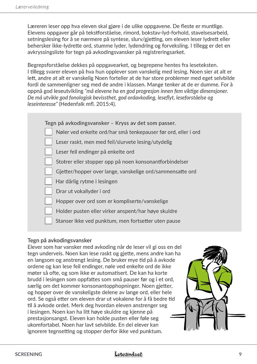 16. Oppgave 9: Les til eleven: Fortell hva du synes er vanskelig med lesing. Dette er et dynamisk element i screeningen. Inviter til dialog om lesing. Noen elever sier de ikke synes det er vanskelig og fortrenger vanskene. Det er også fin informasjon å ha med. Dersom det skjer, spør hva som var vanskelig med teksten hun leste for deg. Spør om hun liker å lese høyt i klassen. Leses det bøker hjemme? Leser noen høyt for henne? Liker hun tegneserier eller vanlige barnebøker? Noen barn synes de det er vanskelig og føler seg dumme som ikke får til å lese godt. De sammenligner seg med de andre elevene og føler seg gjerne stigmatisert. Det er synlig for alle dersom en elev sliter med lesing. Det er også viktig å skape interesse for lesing på nytt hvis den er borte. Leseglede er nøkkelen til å bli en god leser, men den kommer ikke dersom eleven føler det er håpløst og vanskelig.