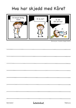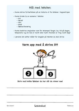 Dette er en serie der elevene oppfordres til å skrive korte tekster eller en tegneseriestripe. Historien er startet på. Elevene avslutter den. Bruk sansene i historien. Tegn videre på tegneserierutene.