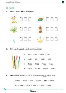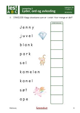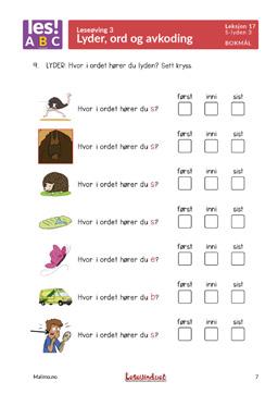 Jobb med enkelttema med korte tekster og avkodingsoppgaver. Finn feil på bilder og let etter ting med riktig lyd. Finn førstelyd, midtlyd og sistelyd. Jobb med syntese og rettskriving, og øv ekstra på nivådelte ordkjeder.