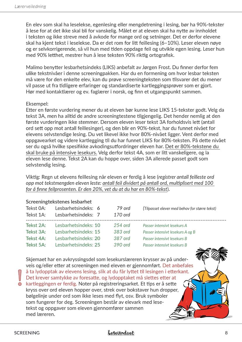 Screeningtekst 0A og 1A er for enkle dersom du skal screene elever som skal delta på intensive lesekurs, men disse kan likevel brukes for å finne elevens nærmeste utviklingssone i lesing opp mot andre leseaktiviteter og øvinger. Dersom eleven ikke leser screeningtekst 2A på LIKS 10 med minst 80% riktighet, er det grunn til å se på alternative øvingsformer til intensive lesekurs, siden tekstene på intensive lesekurs ikke går lavere enn LIKS 9. Les mer på side 19 for å se hvilke serier hos Malimo som passer ut fra lesbarhetsindeks.