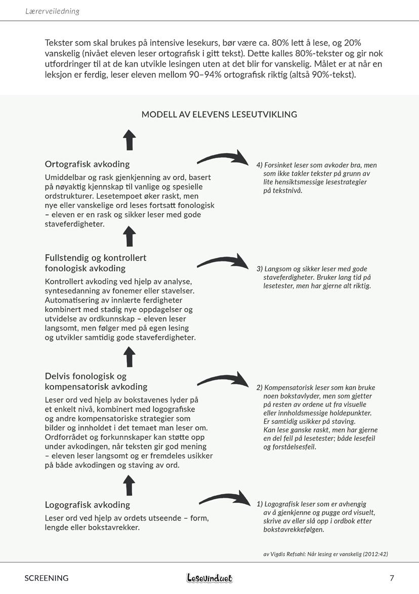 Mange kjenner godt til God leseutvikling av Ingvar Lundberg og Katarina Herrlin (2008). Der finner du et skjema som heter Elevens leseutvikling. Dette skjemaet ligger også på cappelendamm.no, eller du kan google “Elevens_leseutvikling.pdf”. Det anbefales at den som skal jobbe med lesing setter seg inn i forskningen på området. Det anbefales å lese bøkene på kildelisten for å forstå helheten i hvordan du skal analysere og tolke resultatene fra screeningen, i tillegg til de standardiserte testene du bruker for å finne elevens nærmeste utviklingssone.