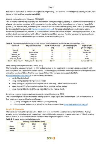 Deep ripping with organic matter (Tempy, 2019) The Tempy trial was sown to Barley in 2019 and comprised of five treatments to compare deep ripping only with inclusion plates and OM addition (details below). All deep ripping treatments were implemented to a depth of 50cm with a tine spacing of 56cm. The OM used was a chicken litter compost blend, applied at 5t/ha (https://www.peatssoil.com.au), in the following treatments; • control (undisturbed) • deep ripping (50cm) with rigid shank (Tilco) • deep ripping (50cm) with inclusion plate (Tilco) operating 150mm below soil surface • deep ripping (50cm) with inclusion plate (Tilco) plus OM surface applied • deep ripping (50cm) with OM deep placed behind the ripping shank. Break crop response to deep ripping and organic matter (Kooloonong, 2019) The Kooloonong trial was established for a range of break crops; lupin, lentil and chickpea. Each trial comprised of four treatments arranged in a factorial design; • +/- deep ripping (50cm depth with tine spacing of 56cm) • +/- surface OM application at 5t/ha (chicken litter compost blend https://www.peatssoil.com.au).