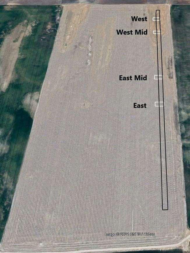 In the faba bean paddock, four monitoring sites were established, while three sites were established in the field pea paddock (Figure 1 and Figure 2). Both commercial crop paddocks were sown and managed by the collaborating farmer.