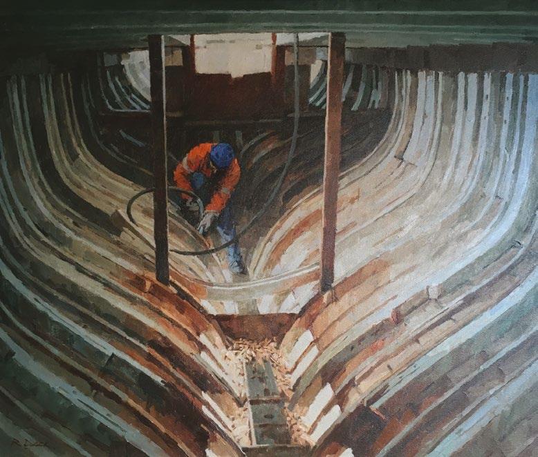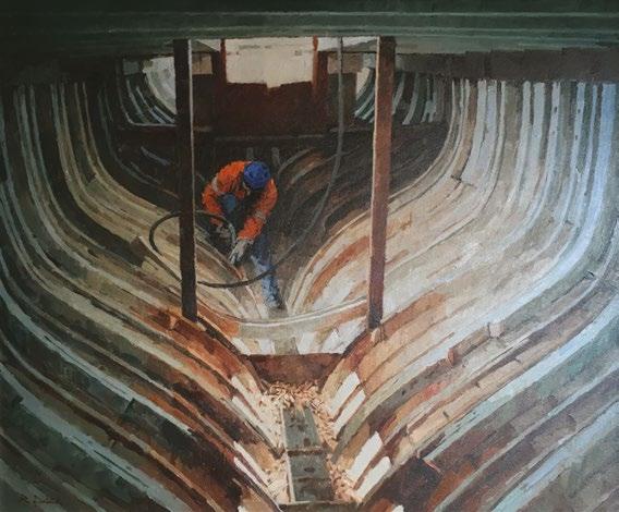 “When presented with such a superb collection of paintings, where each has great appeal for very different reasons, the task of selecting the winner is hard. 'The Shipwright', by Richard Dack, is our selection this year. A fine picture, the composition of frames inside the hull drawing the eye to the solitary worker, dressed in orange in a dark enclosed space, lit from above, works very well. But what really took this painting to the next level are the feelings it evokes in me; of the ship as a structure of natural form that cradles and keeps safe its crew; of the heroism of the graft and grit often involved in ship building and the frequently solitary nature of the work, as difficult but vital tasks are completed, often alone and in challenging places. While our congratulations go to all the finalists, our deep pleasure in offering this prize to Richard reflects the way his painting connected with this observer powerfully and personally. Thank you for the privilege of viewing this exceptional work.”
