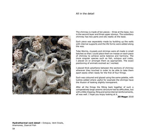 The chimney is made of ten pieces – three at the base, two in the second layer and three upper storeys. The subsidiary chimney has two parts and sits neatly at the base. Each piece was separately made by building up the walls with internal supports and the life forms were added along the way. Tube Worms, mussels and shrimps were all made in small batches so that I could place them en masse on each piece of chimney to achieve some balance and harmony. The more singular species such as fish, octopus and crabs, I placed on or amongst them as appropriate. The exact positioning of animals evolved as I worked. I placed thick polythene between the sections of chimney wherever they touched in order to be able to take them apart easily when ready for the first of four firings. Each was coloured and glazed using the same palette, with lustres added where useful for example the shrimps have the illusion of looking slightly transparent. After all the firings the fitting back together of such a comparatively large ceramic structure had its difficulties, but with a little chipping, filing and some internal reinforcements, all was well. I hope you enjoy looking at it. Jill Moger 2018