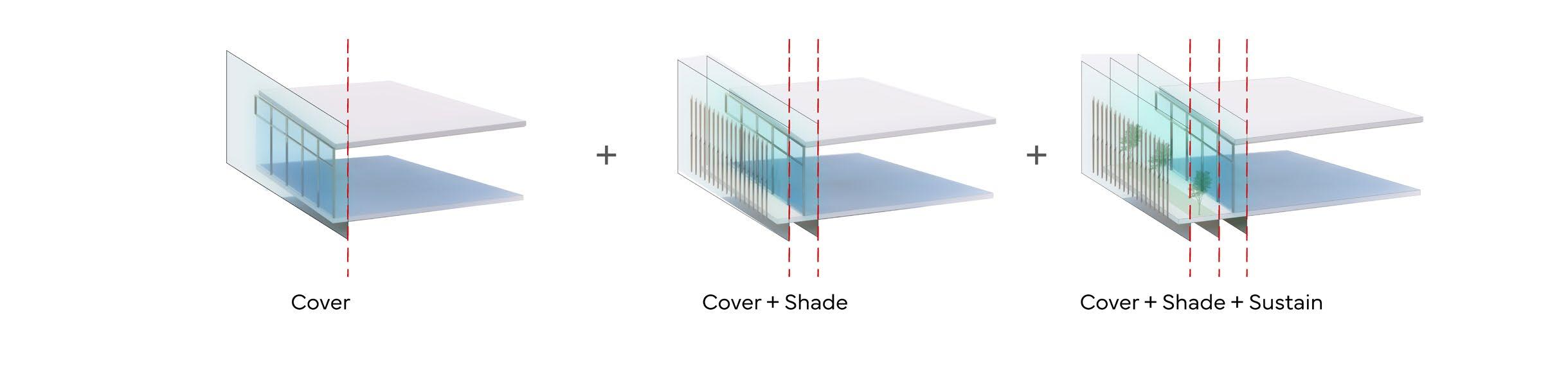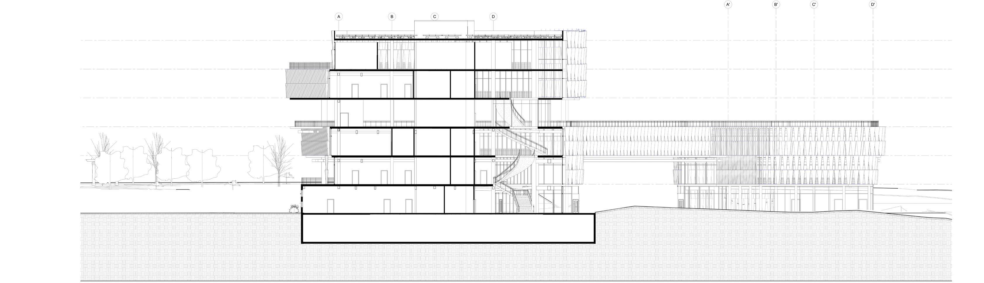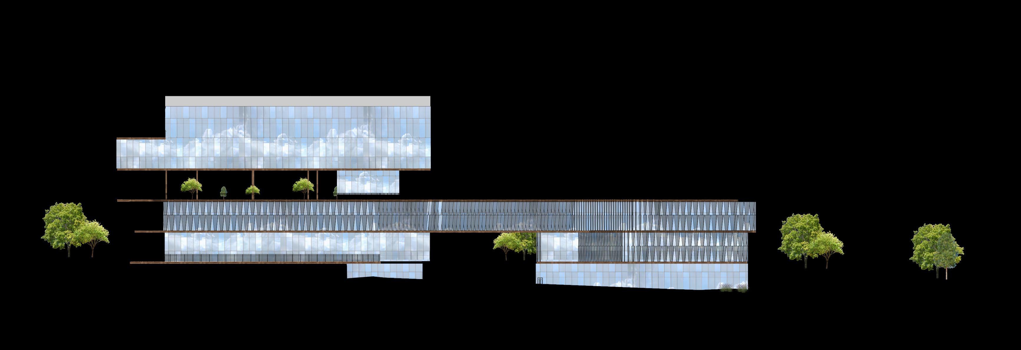 The facade of the building was designed based on the solar heat gain. The louvers of the facade are placed in direction of the sunlight to maximze shading into the office spaces and minimize the energy usage of the building. Henceforth, the materials of the building are carefully choosen considering the surroundings and sustainabilty.