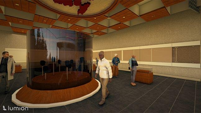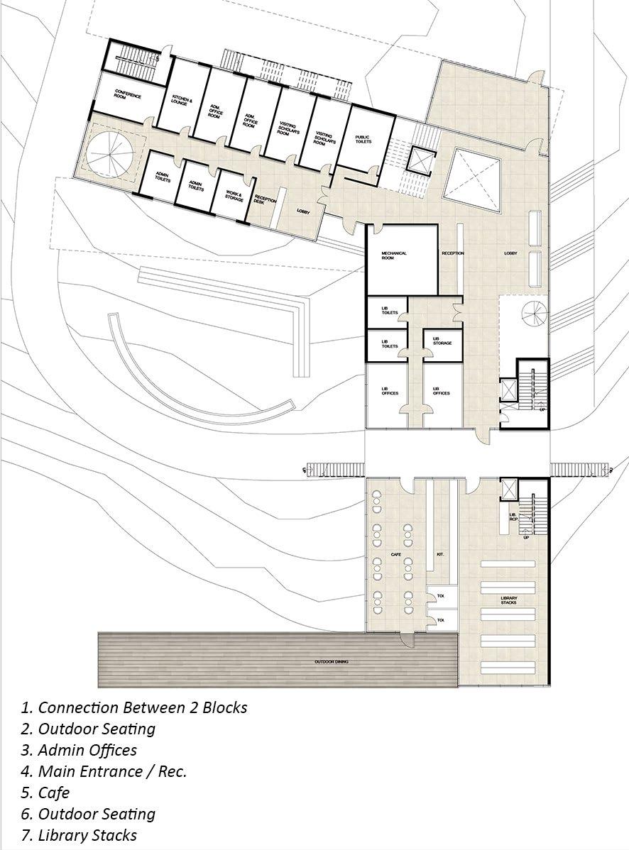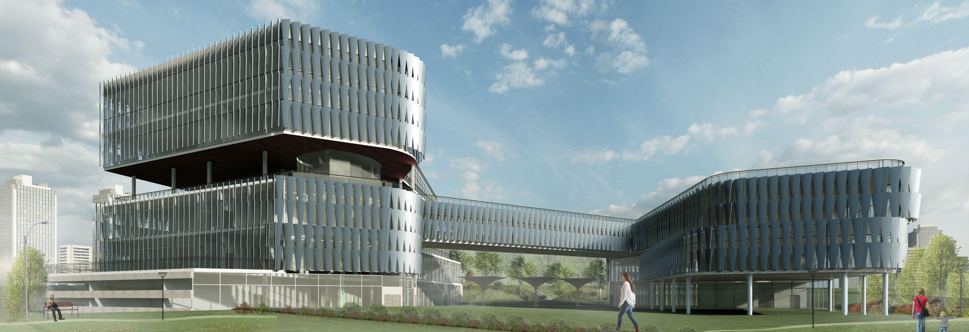 The building stands as two harmonious elements, each reflecting the other in form but contrasting in function—one, private, dedicated to control rooms, offices, and emergency operations; the other, public, with spaces for gathering, including a dining hall, auditorium, and exhibition halls. Linking these distinct identities, a bridge soars, spanning across the natural plaza.