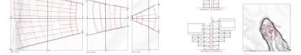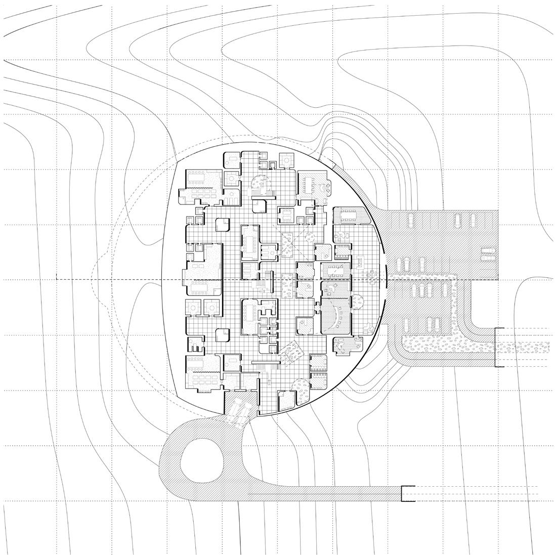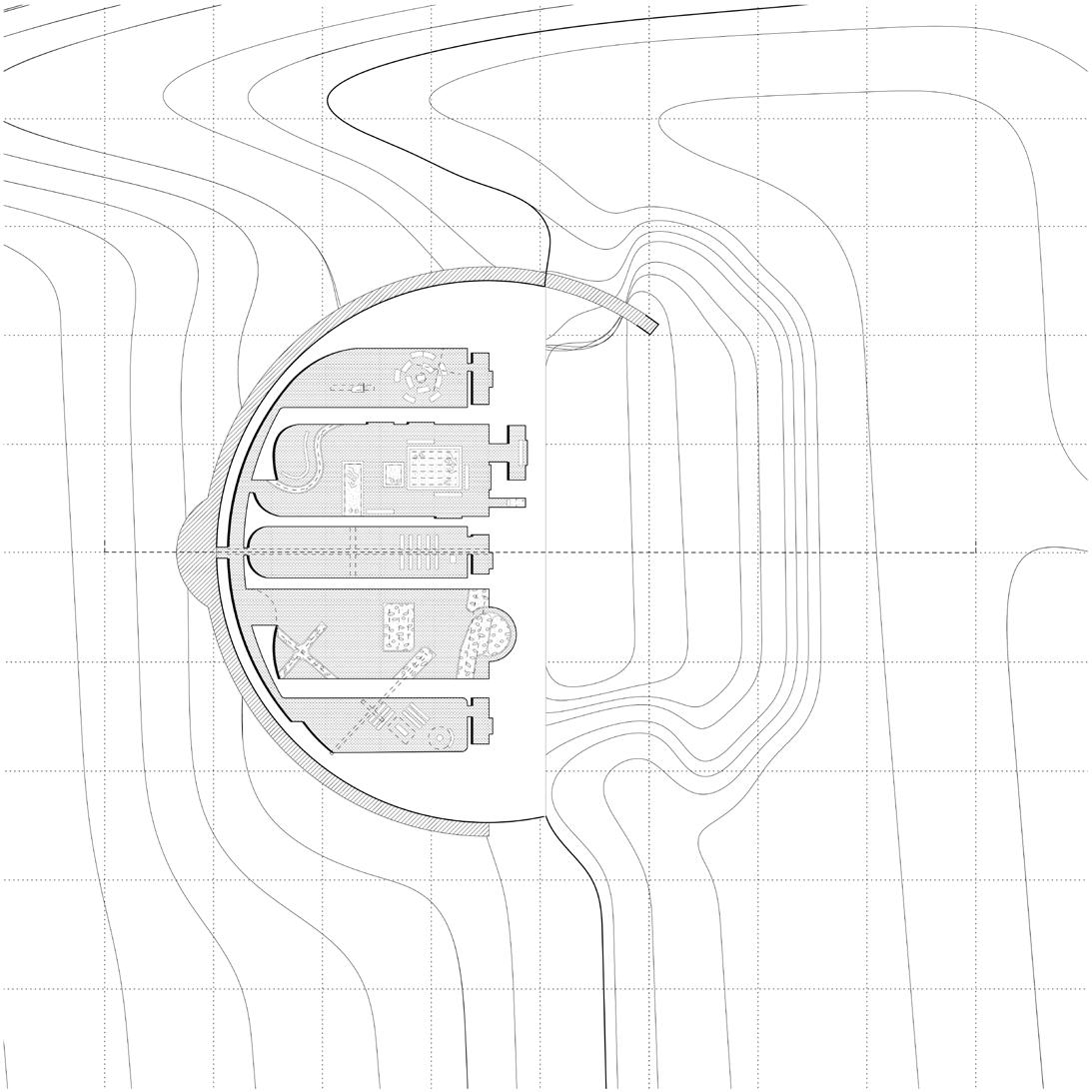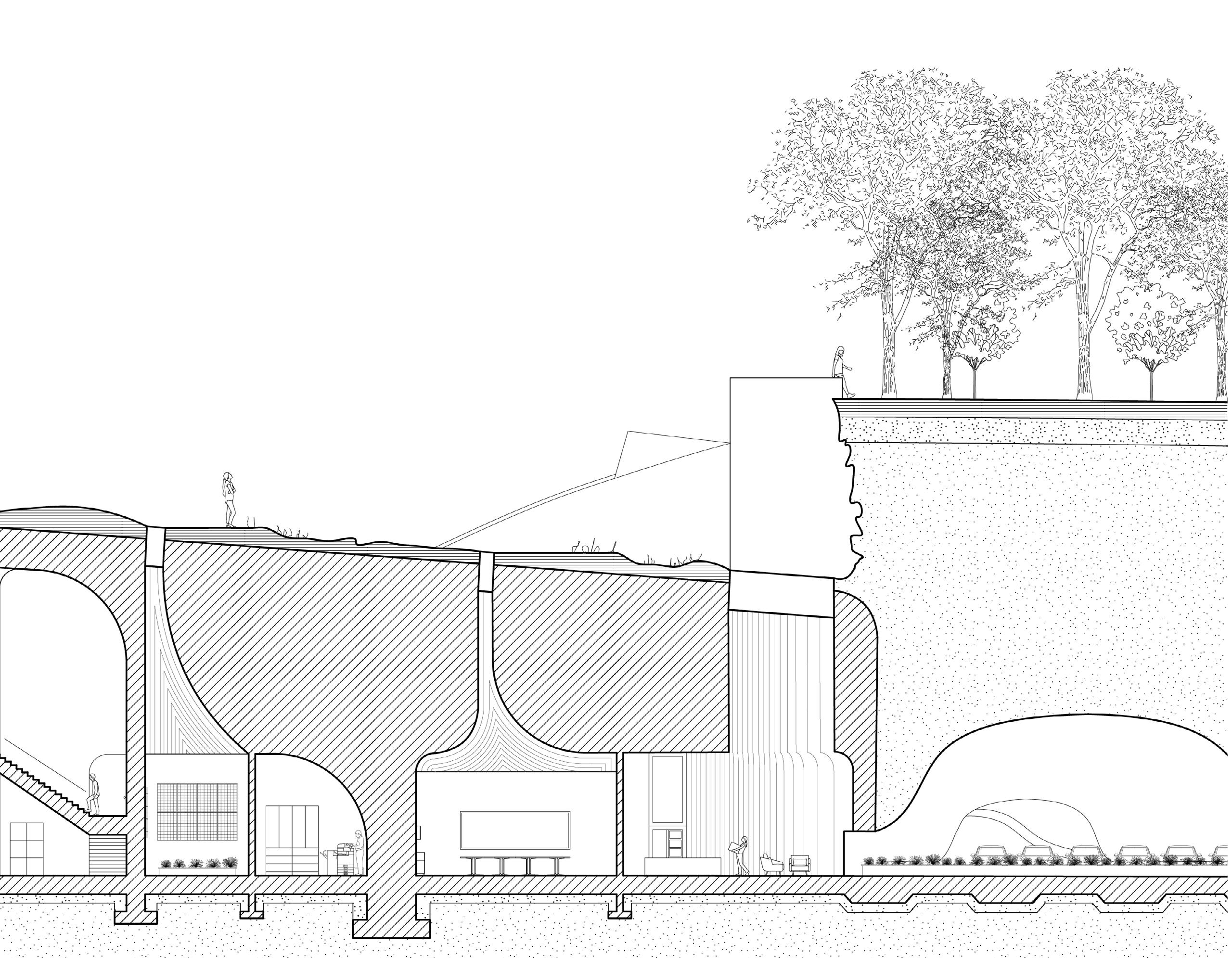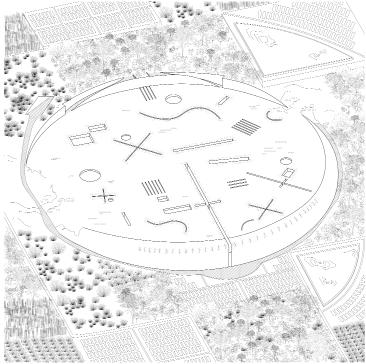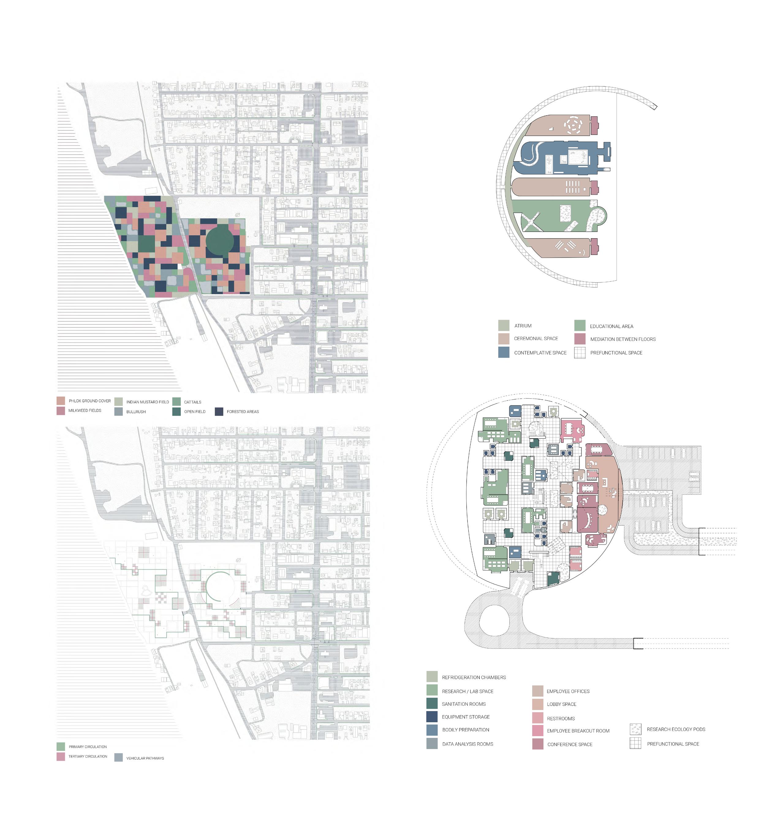 THE SLOPE OF THE LAND DROPS APPROXIMATELY 30 FEET RUNNING EAST TO WEST, SO IT WAS IMPORTANT TO STUDY THE SECTIONAL QUALITIES OF THE BUILDING. ORIGINAL SKETCHES SHOW THE INITIAL IDEAS OF HAVING A BUILDING THAT IS HALF BURIED BENEATH THE GROUND----SLIGHTLY TILTED UPWARDS BASED ON A SINGLE RADIAL POINT. OVERALL ORGANIZATION OF THE LANDSCAPE AND ORIENTATION OF THE BUILDING IS BASED OFF OF A CHOSEN PARTI (CIRCLE) AND PATTERN (GRID). SEVERAL RESTORATIVE PROCESSES HAVE BEEN IMPLEMENTED ON THE SITE INCLUDING RETAINING PONDS TO COMBAT THE FLOOD-PRONE SOIL, TERRACED BURIAL SPACES, AND A TRAIN TUNNEL THAT EXTENDS THE AMOUNT OF ECOLOGY ON THE SOFT-SCAPE