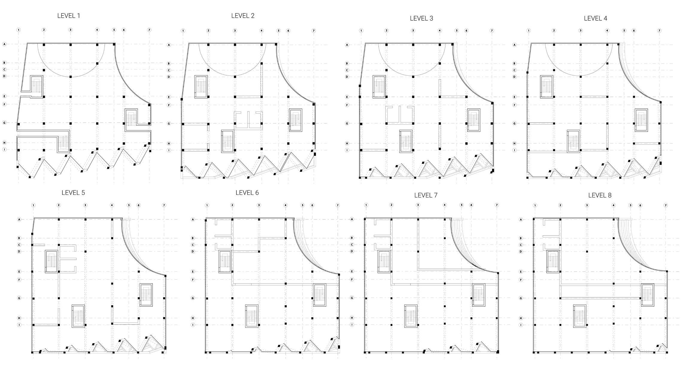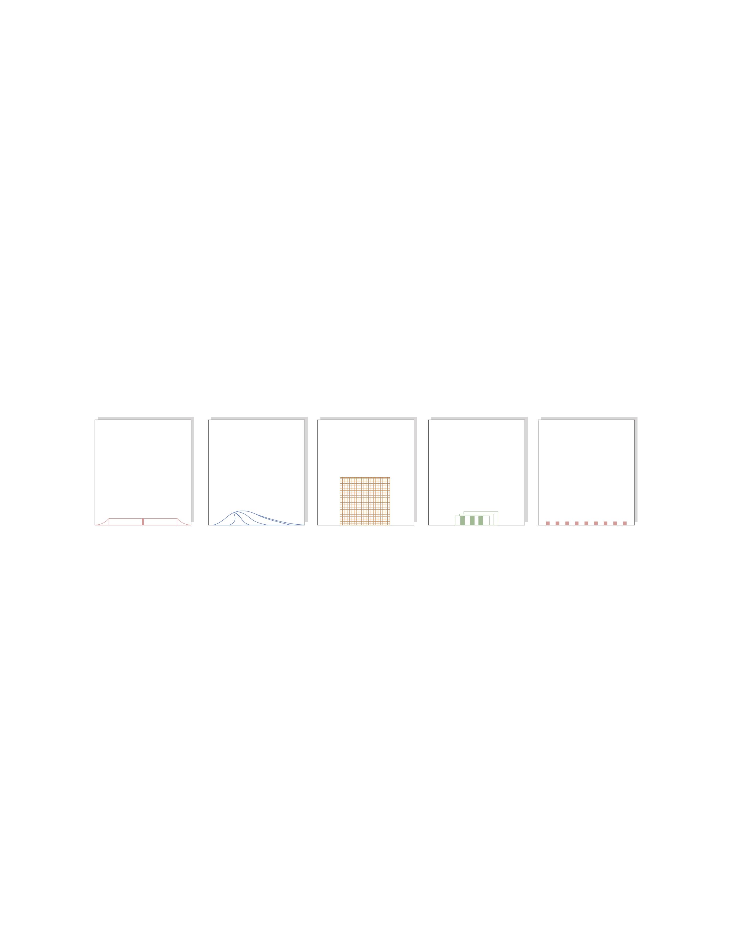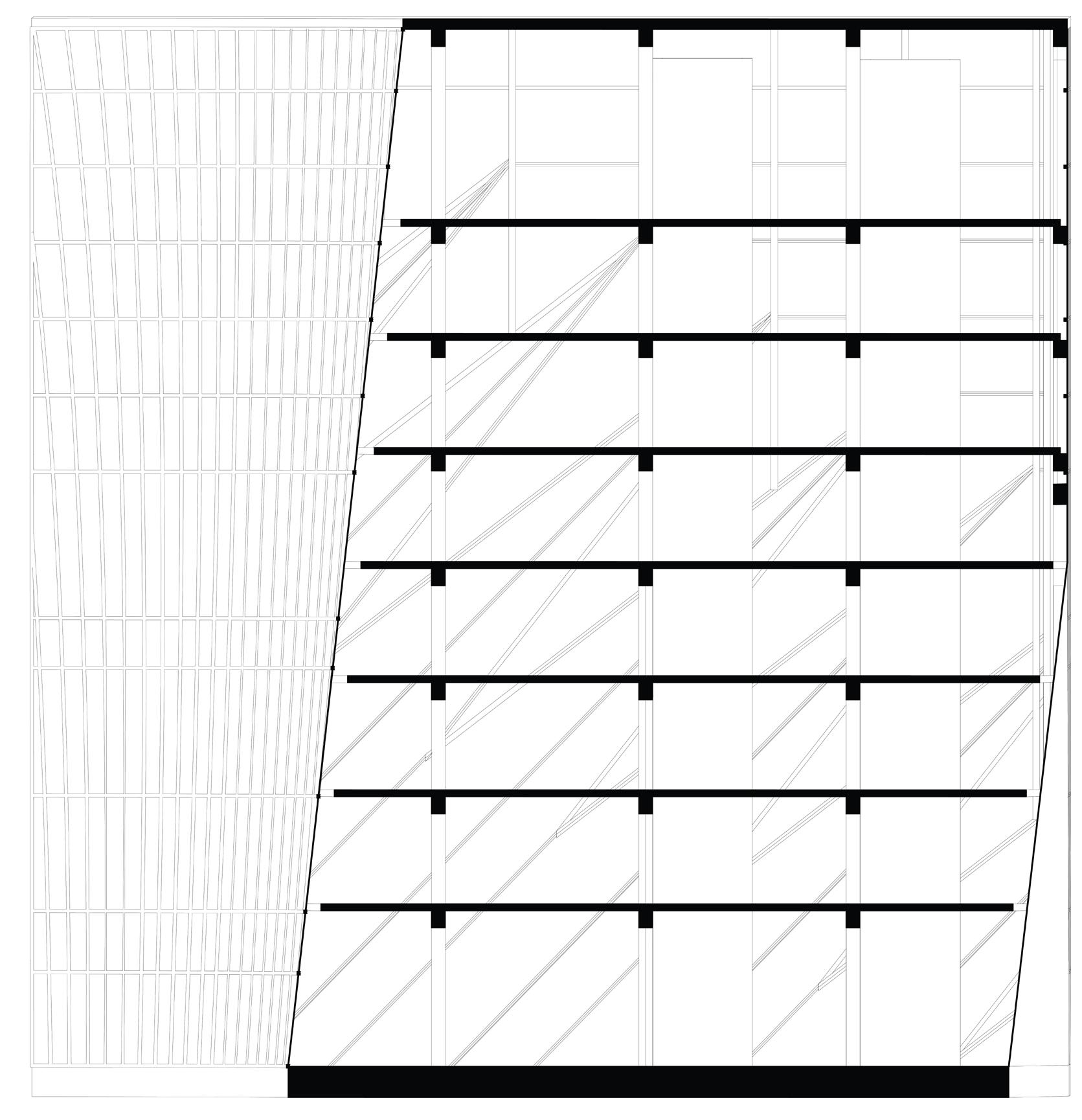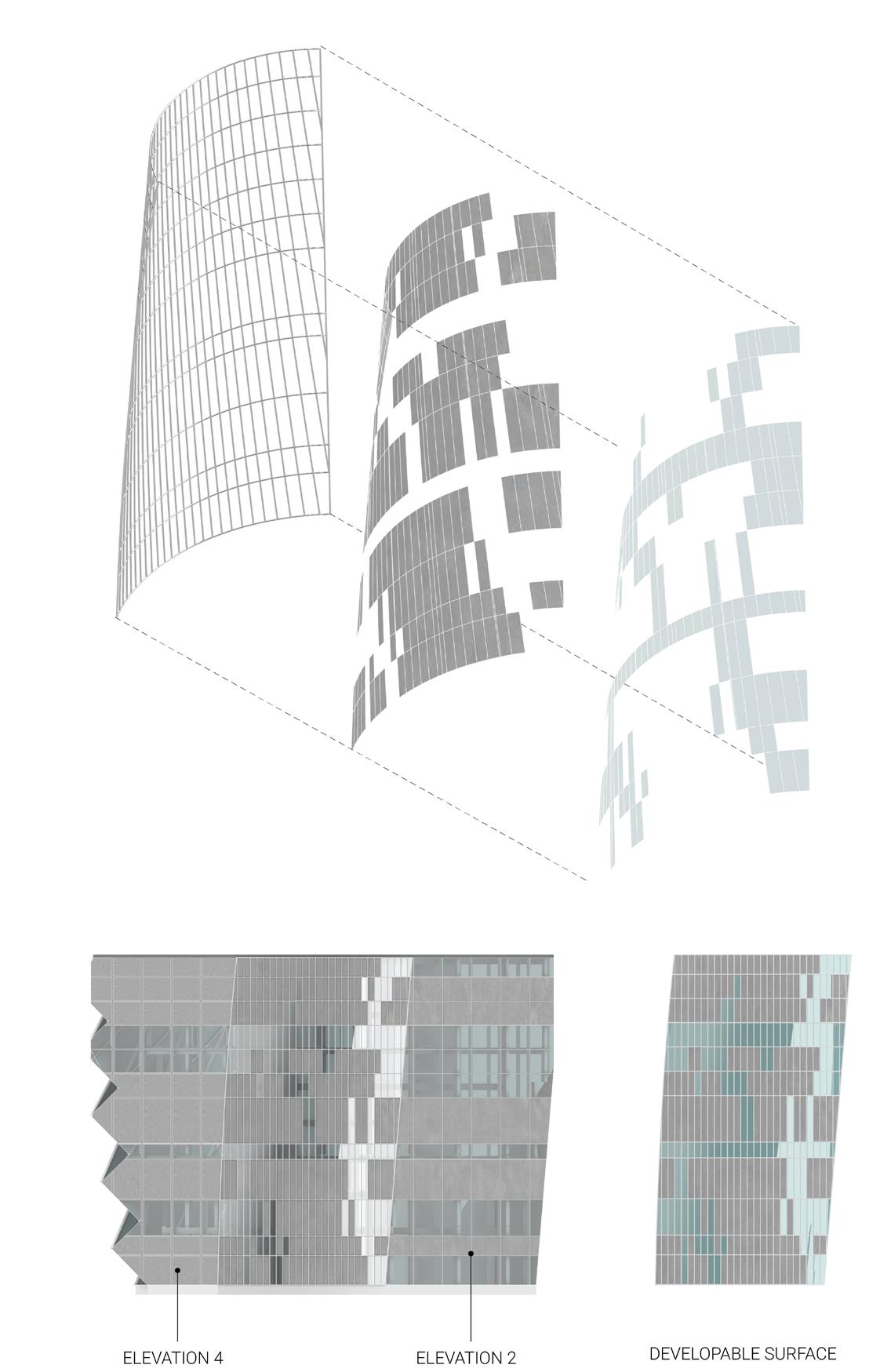 THIS DESIGN EXPERIMENTS WITH THE USE OF RULED GEOMETRY ON A BUILDING’S FACADE, CONSIDERING HOW AN ENVELOPE SYSTEM CAN EXPRESS ITS INTERNAL MEMBERS. THIS MIXED OCCUPANCY MULTI-STORY BUILDING IS CONSTRUCTED OUT OF STEEL FRAMING AND IS SET WITHIN A GRIDDED 20’ X 20’ COLUMN SYSTEM. THE THREE MAIN FACADE MATERIALS IS A MIX BETWEEN LOW-E WINDOW GLAZING, INSULATED METAL PANELS, AND STEEL MULLIONS THAT MAKE UP A UNITIZED CURTAIN WALL SYSTEM.