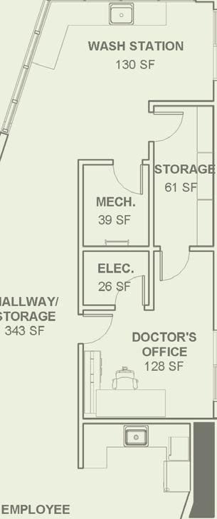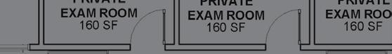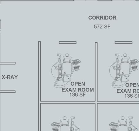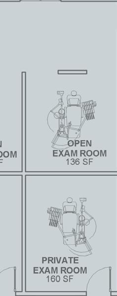 THIS DESIGN ALSO ALLOWS FOR OPTIMAL SPACE FOR DENTISTRY EQUIPMENT THROUGHOUT THE OFFICE. THESE ELEMENTS INCLUDE DENTAL CHAIRS, OPERATING LIGHTS, X RAY AREAS / SHELVING, SPACE FOR PPE STORAGE, TOUCH-LESS OPERATING SYSTEMS TO ENTER ROOMS, AND PROPER PATIENT MANAGEMENT COMPUTER SYSTEMS TO ORGANIZE HEALTH RECORDS WITHIN THE RECEPTION SPACE.