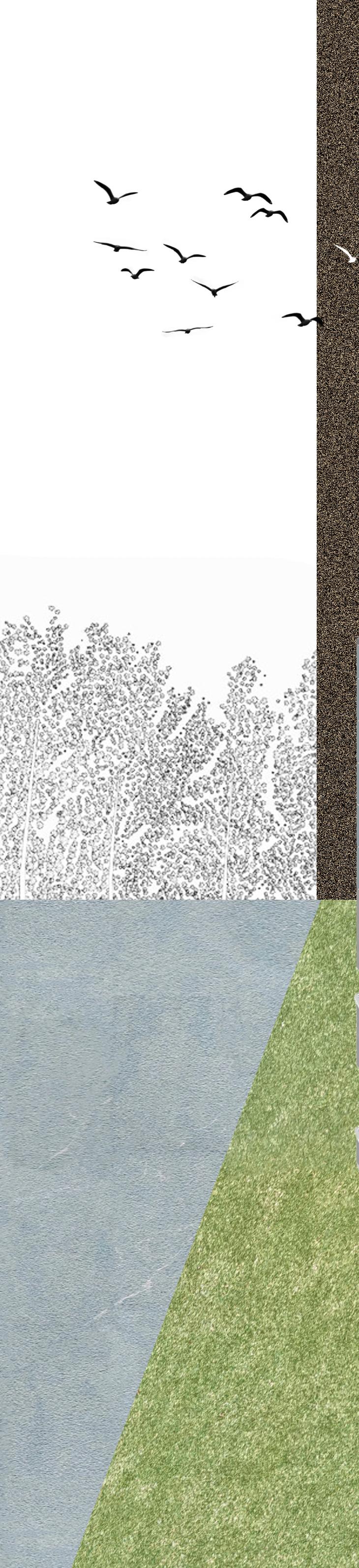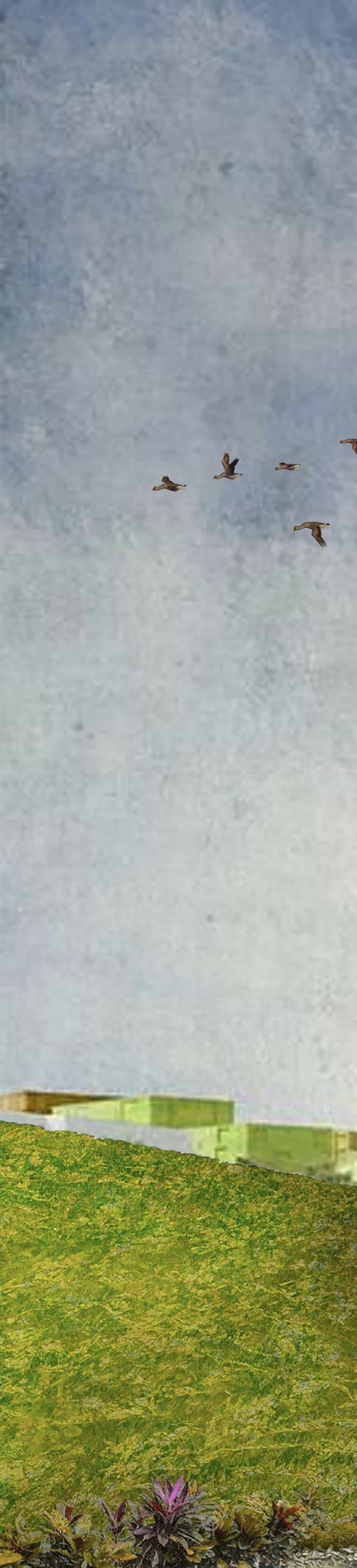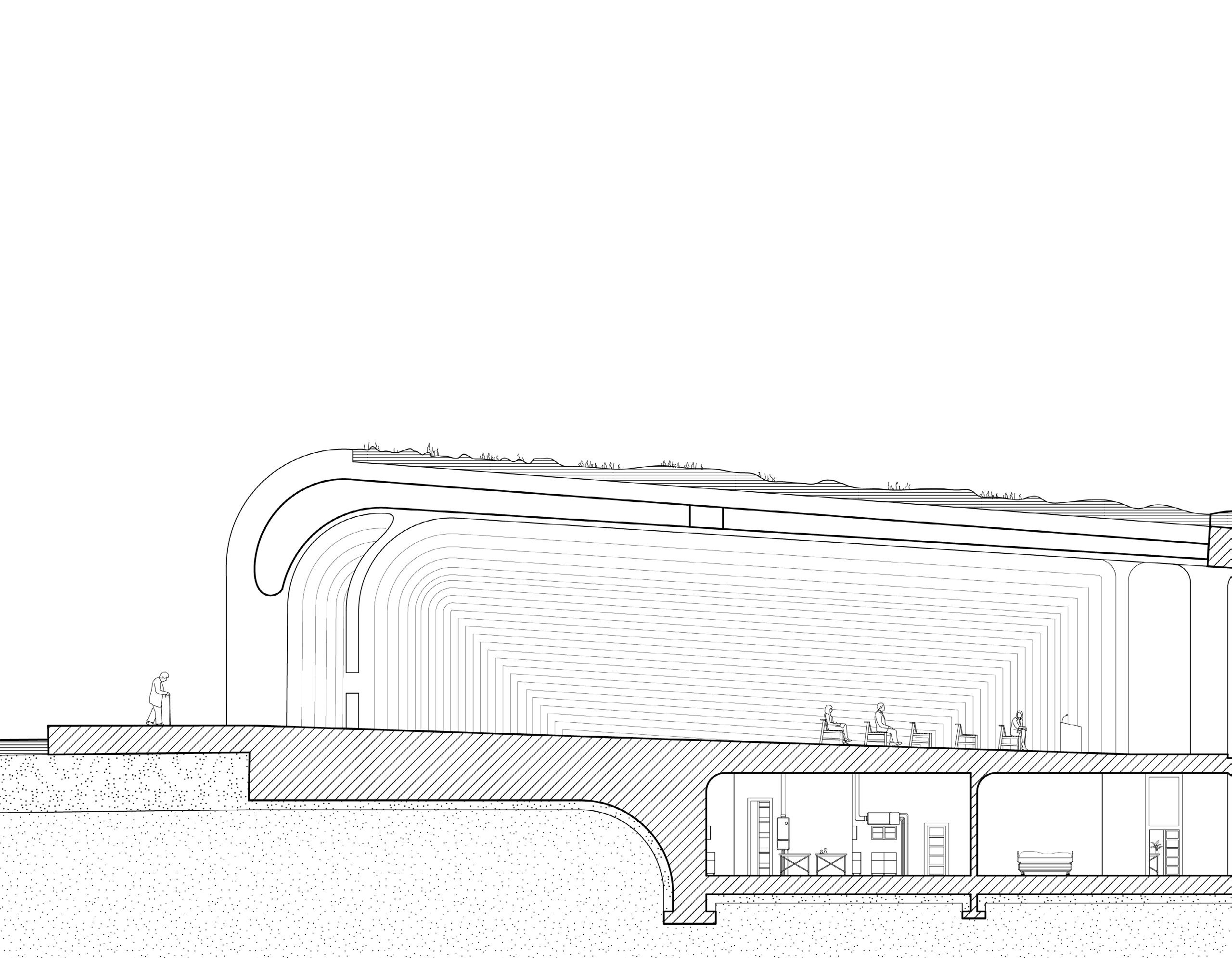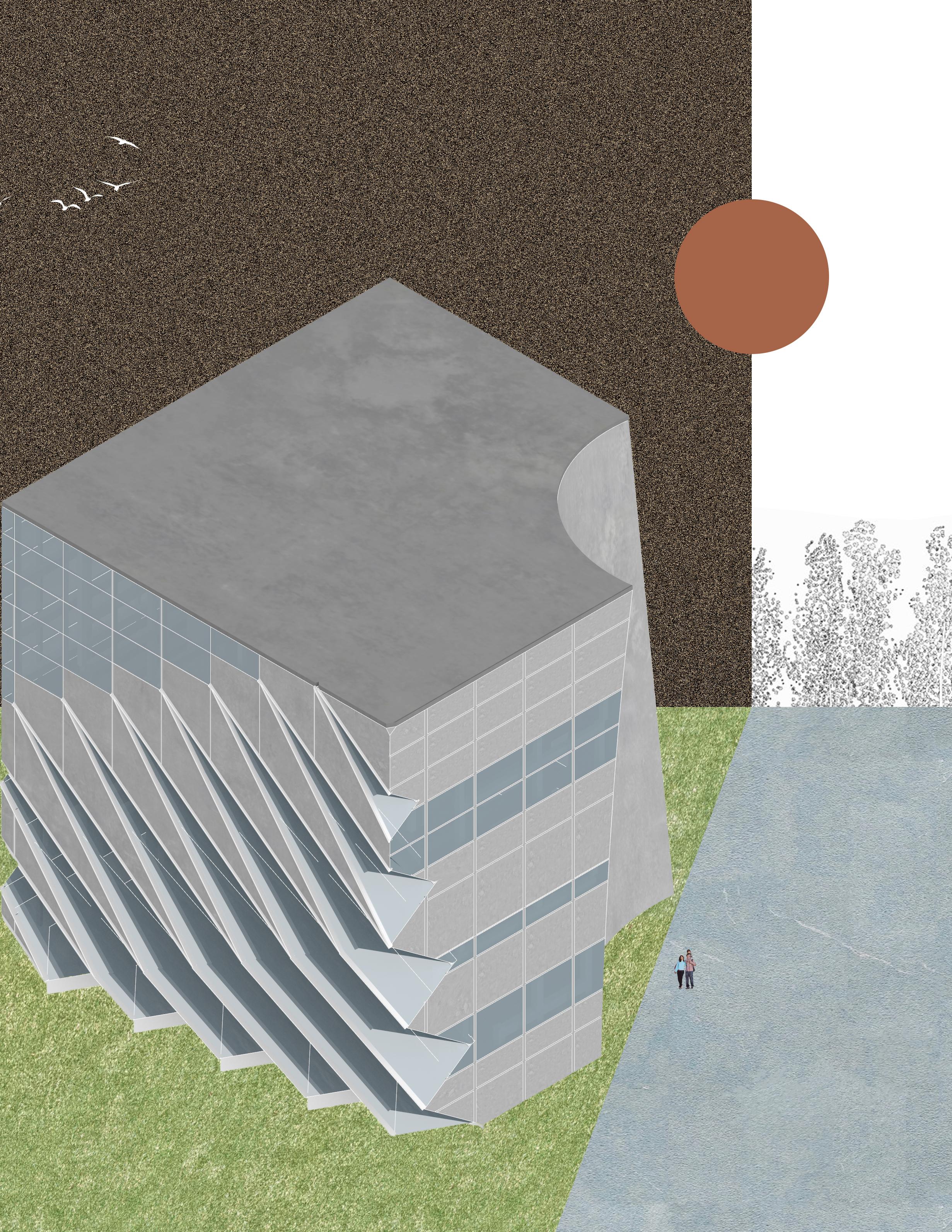 THE BUILDING----LOCATED IN THE TOP OF THE SITE---HOLDS SEVERAL PROGRAMMATIC PIECES THAT BOTH RESTORE ECOLOGY AND AID FUNERAL SERVICES. THE EXTERIOR OF THE BUILDING IS A SLIVER OF A MONUMENTAL, CONCRETE FACADE. ITS PERIMETER CONTAINS A PROCESSION PATH FOR VISITORS TO OVERLOOK THE ENTIRE SITE AND OHIO RIVER. A COMPOSITION OF SHAPES LOCATED ON THE ROOF OF THE BUILDING ACT AS SKYLIGHTS TO BRING NATURAL LIGHT TO THE ENTIRE STRUCTURE, WHILE ALSO ALLOWING THOSE WALKING ACROSS THE ROOF TO VIEW CEREMONIES OCCURRING BELOW.