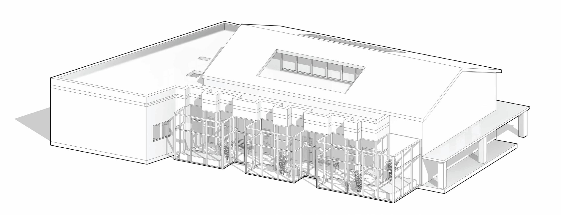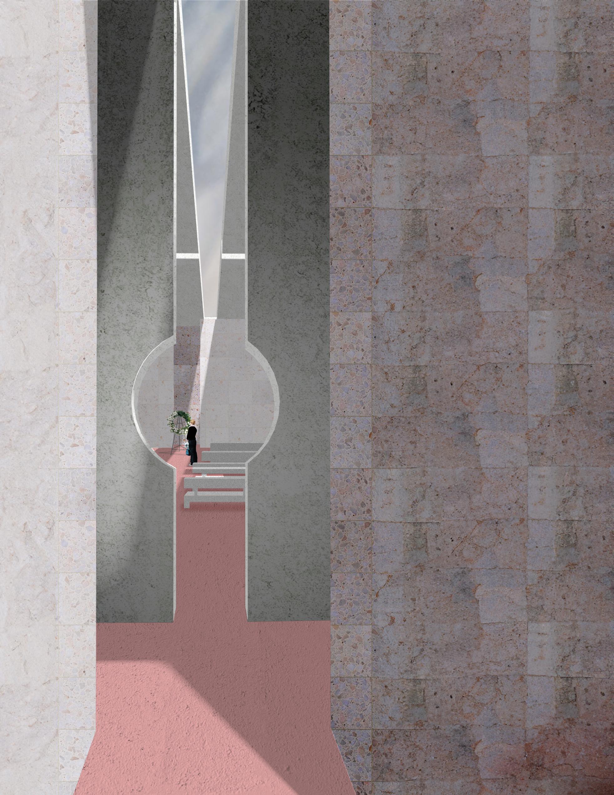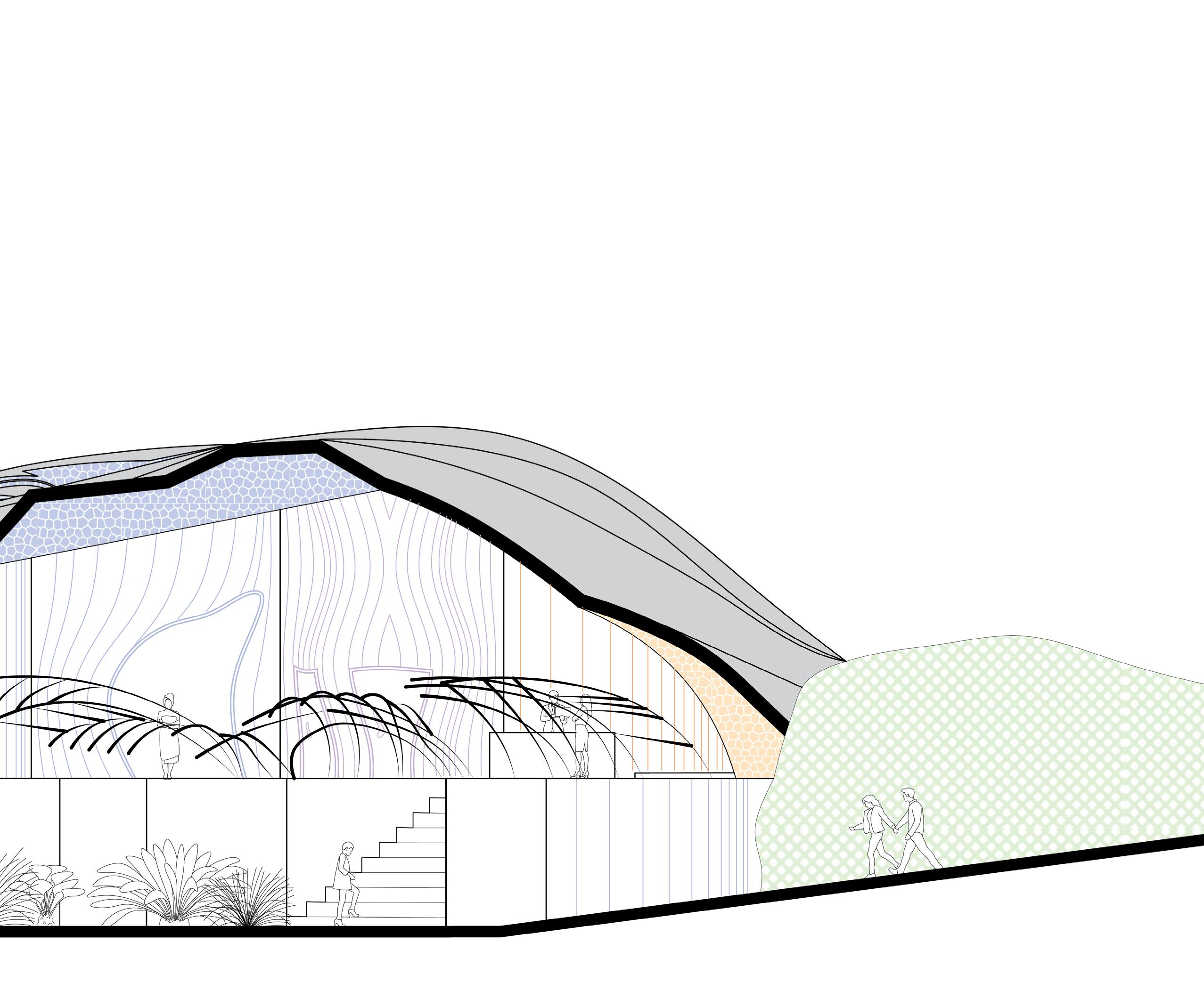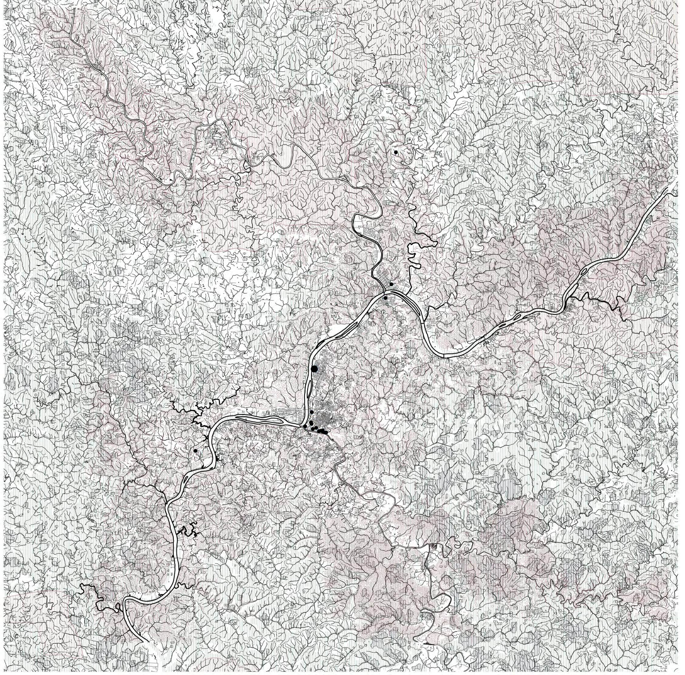 THE BUILDING----LOCATED IN THE TOP OF THE SITE---HOLDS SEVERAL PROGRAMMATIC PIECES THAT BOTH RESTORE ECOLOGY AND AID FUNERAL SERVICES. THE EXTERIOR OF THE BUILDING IS A SLIVER OF A MONUMENTAL, CONCRETE FACADE. ITS PERIMETER CONTAINS A PROCESSION PATH FOR VISITORS TO OVERLOOK THE ENTIRE SITE AND OHIO RIVER. A COMPOSITION OF SHAPES LOCATED ON THE ROOF OF THE BUILDING ACT AS SKYLIGHTS TO BRING NATURAL LIGHT TO THE ENTIRE STRUCTURE, WHILE ALSO ALLOWING THOSE WALKING ACROSS THE ROOF TO VIEW CEREMONIES OCCURRING BELOW.