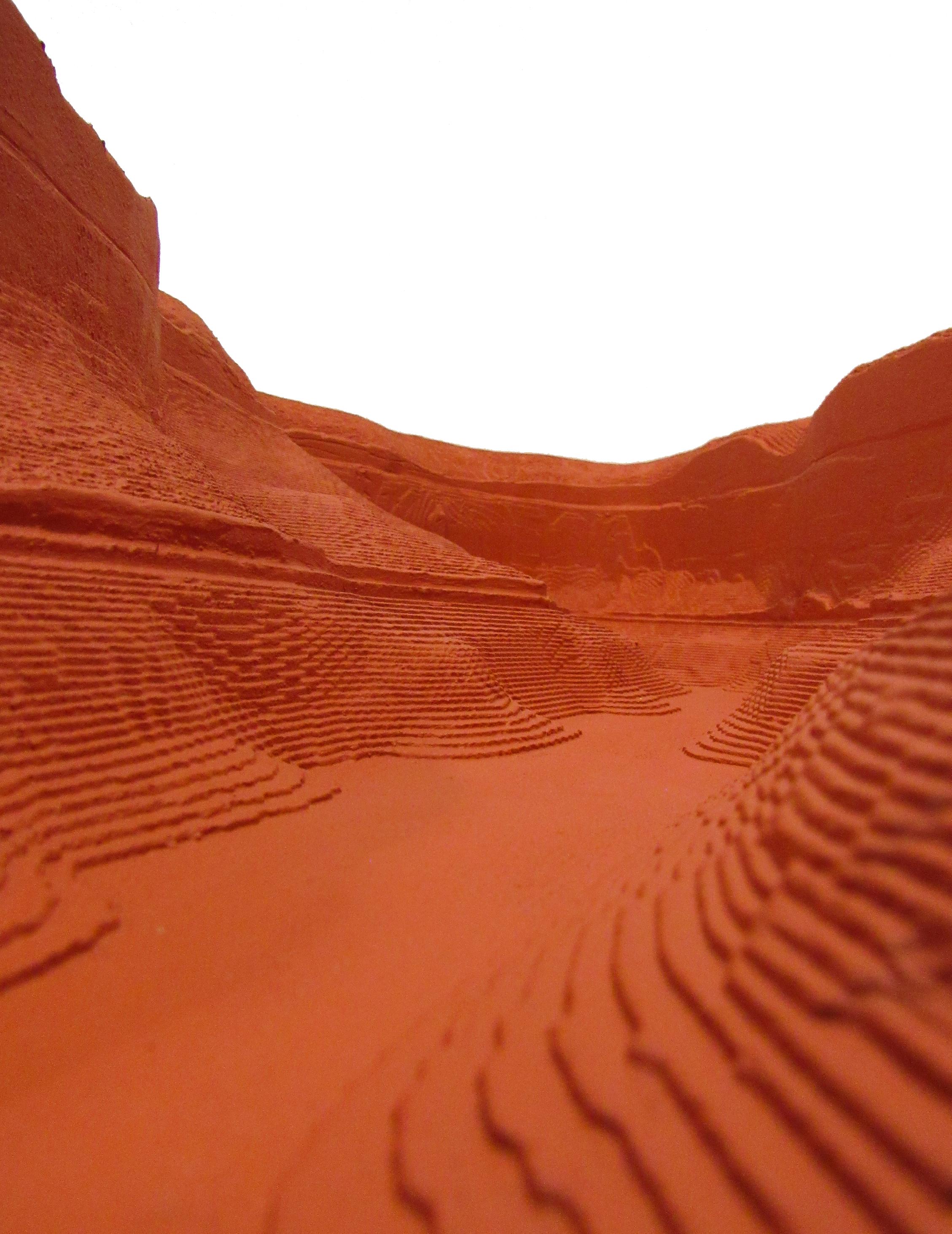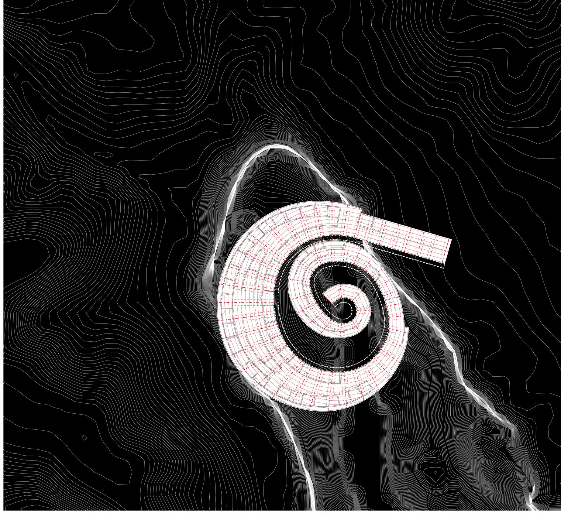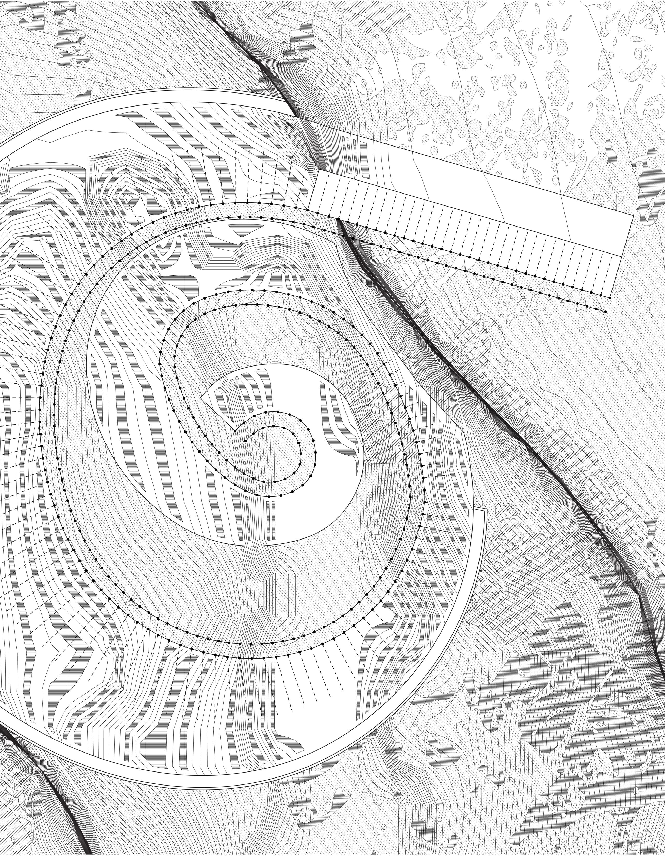 THE FORM OF THIS RESEARCH LAB DESCENDS AS SPIRAL FORM INTO THE CANYON. THIS MESA---APPROXIMATELY 120 FT TALL---PROVIDES SPACE FOR VARIOUS PROGRAMMATIC ELEMENTS TO BE HELD WITHIN ITS MICROCLIMATE. THE DESIGN OF THIS BUILDING EMPHASIZES A JOURNEY, HIGHLIGHTING THE ENTRANCE AND ENDING OF THE SPIRAL. AS OCCUPANTS APPROACH THE BUILDING ENTRANCE THEY HAVE THE CHOICE OF DESCENDING INTO THE MAIN LIVING SPACE OR ASCENDING TO THE WALKABLE ROOF. THE END OF THE SPIRAL HOLDS SPACE FOR AN ALL CONFERENCE MEETING ROOM THAT CAN ACT AS A SPACE FOR GROUP ANALYSIS AND LECTURES. ALL THE WHILE, OCCUPANTS OF THE SPACE ARE AT THE LOWEST POINT OF THE CANYON, SURROUNDED BY THE ENVIRONMENT IN WHICH THEY ARE STUDYING.