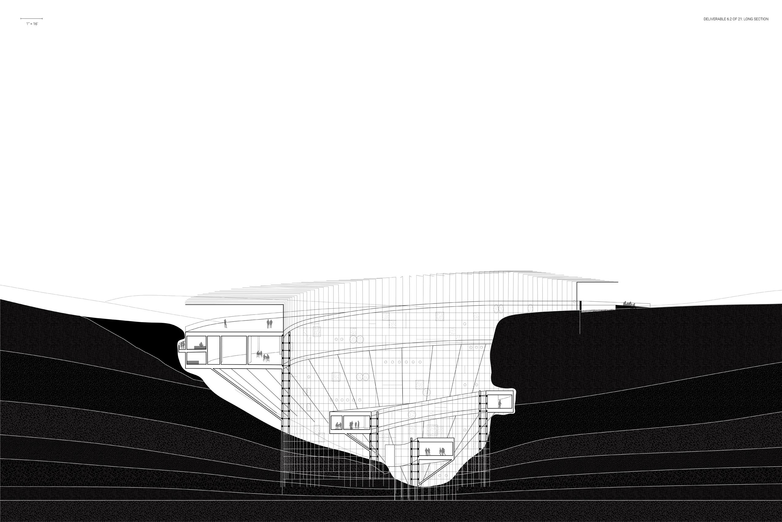 THE ROOF IS HIGHLY ARTICULATED BY A PROJECTED PATTERN OF THE CANYON’S TOPOGRAPHY. A SYSTEM OF POLYCARBONATE AND BITUMEN ROOFING ALLOWS FOR AN OPTIMIZED AMOUNT OF INDIRECT, NATURAL LIGHT THROUGHOUT THE INTERIOR OF THE BUILDING.
