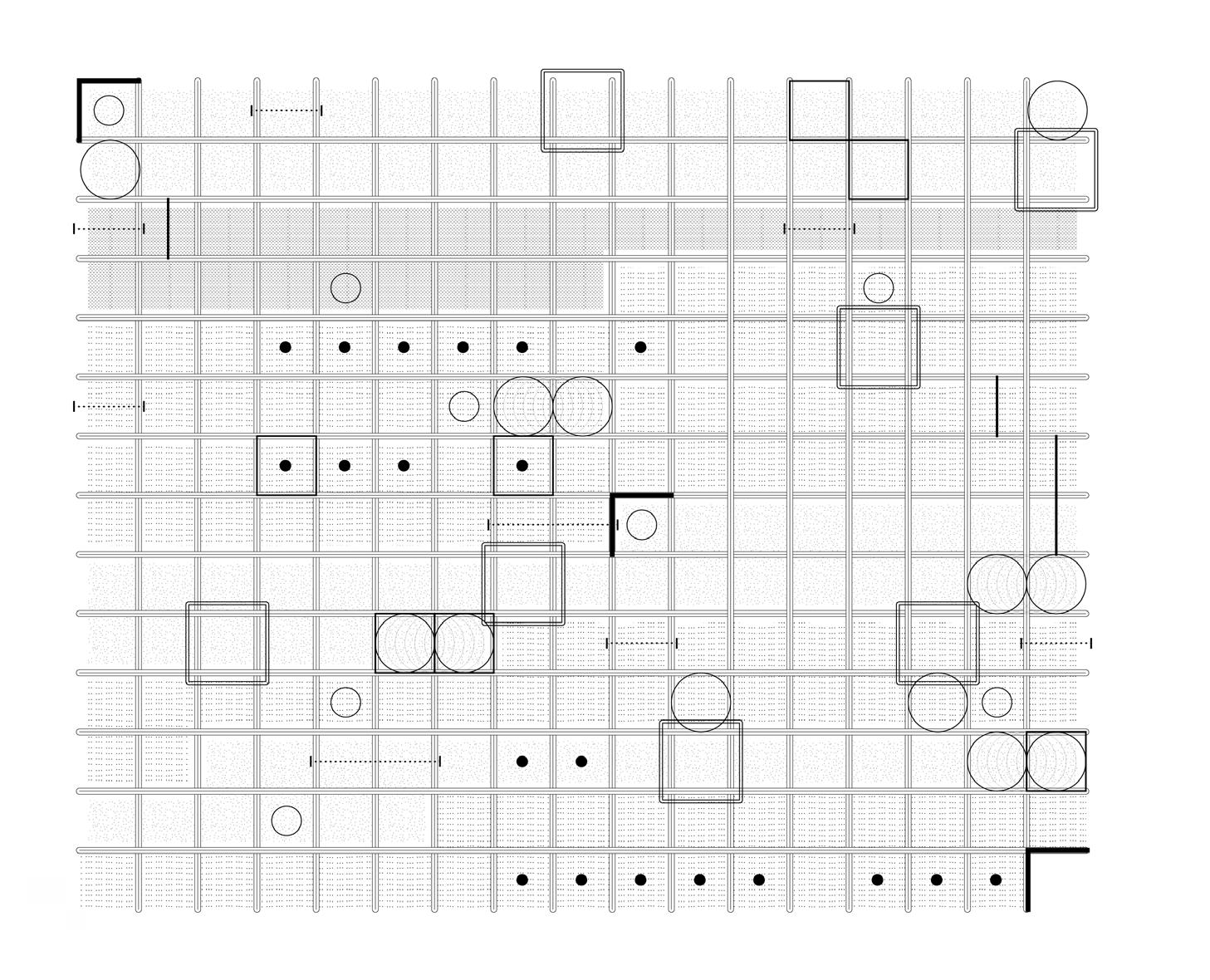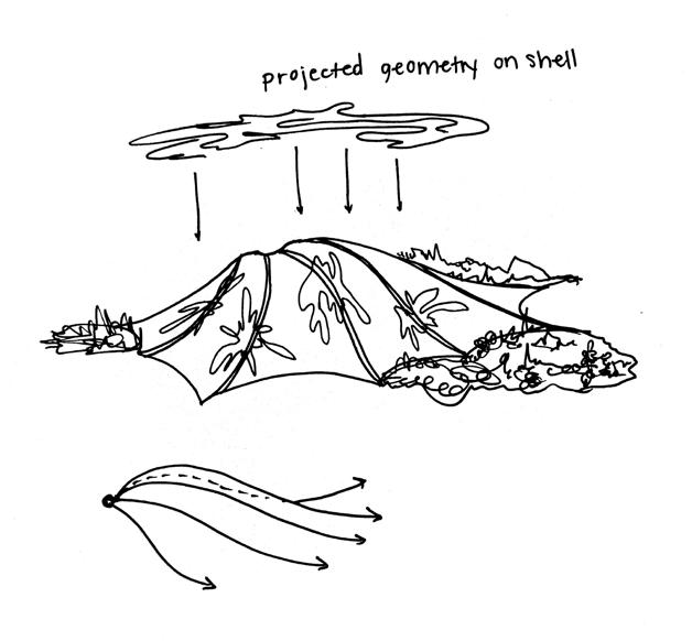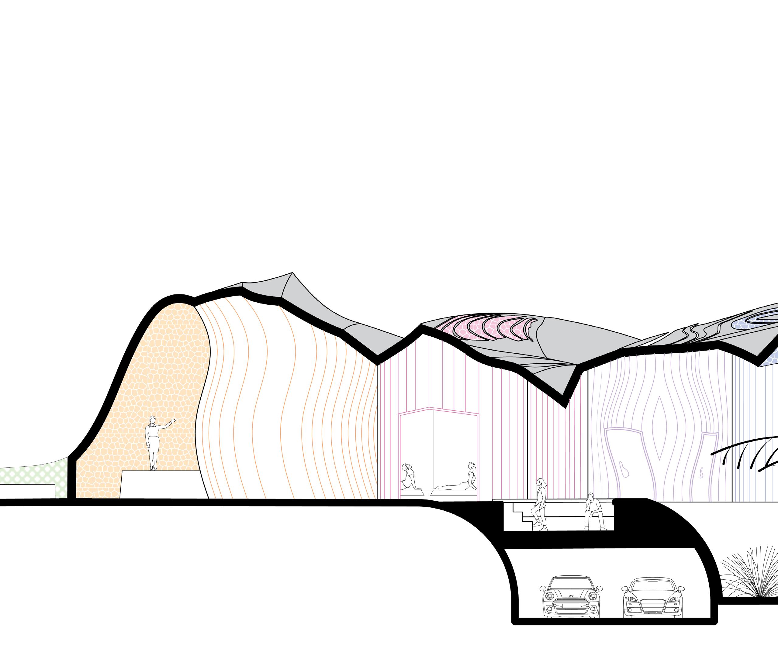 THE FORM OF THIS STRUCTURE WAS GENERATED FROM THE PATTERNS OF OCCUPATIONAL MOVEMENT. A SHELL WAS FORMED FROM BRIDGING THE TWO OPPOSING SIDES OF THE SITE---CAMPUS LIFE TO BUSINESSES. TO CREATE A STARK DIFFERENCE BETWEEN THE INTERIOR AND EXTERIOR OF THE BUILDING, A GRAND ENTRANCE DESCENDS TO A CAVE-LIKE ATMOSPHERE. THE ENTIRE STRUCTURE HEAVILY DEPENDS ON ARTIFICIAL LIGHTING, CREATING CURATED SPACES THAT REFLECT SPECIFIC EMOTIONS. VARYING COLOR, LIGHTING, AND TEXTURES DIFFERENTIATE THE ATMOSPHERE EXPERIENCE FOR VISITORS. ADDITIONAL LIGHTING METHODS ARE USED THROUGH PUNCHED-OUT SLIVERS IN THE STEEL ROOF. THE APERTURES---FORMED FROM INDEPENDENT MEDITATIVE PRACTICES SEEN IN THE SKETCH TO THE LEFT---ARE PROJECTED ONTO THE ROOF, CREATING OPENINGS FOR LIGHT TO PEEK THROUGH.