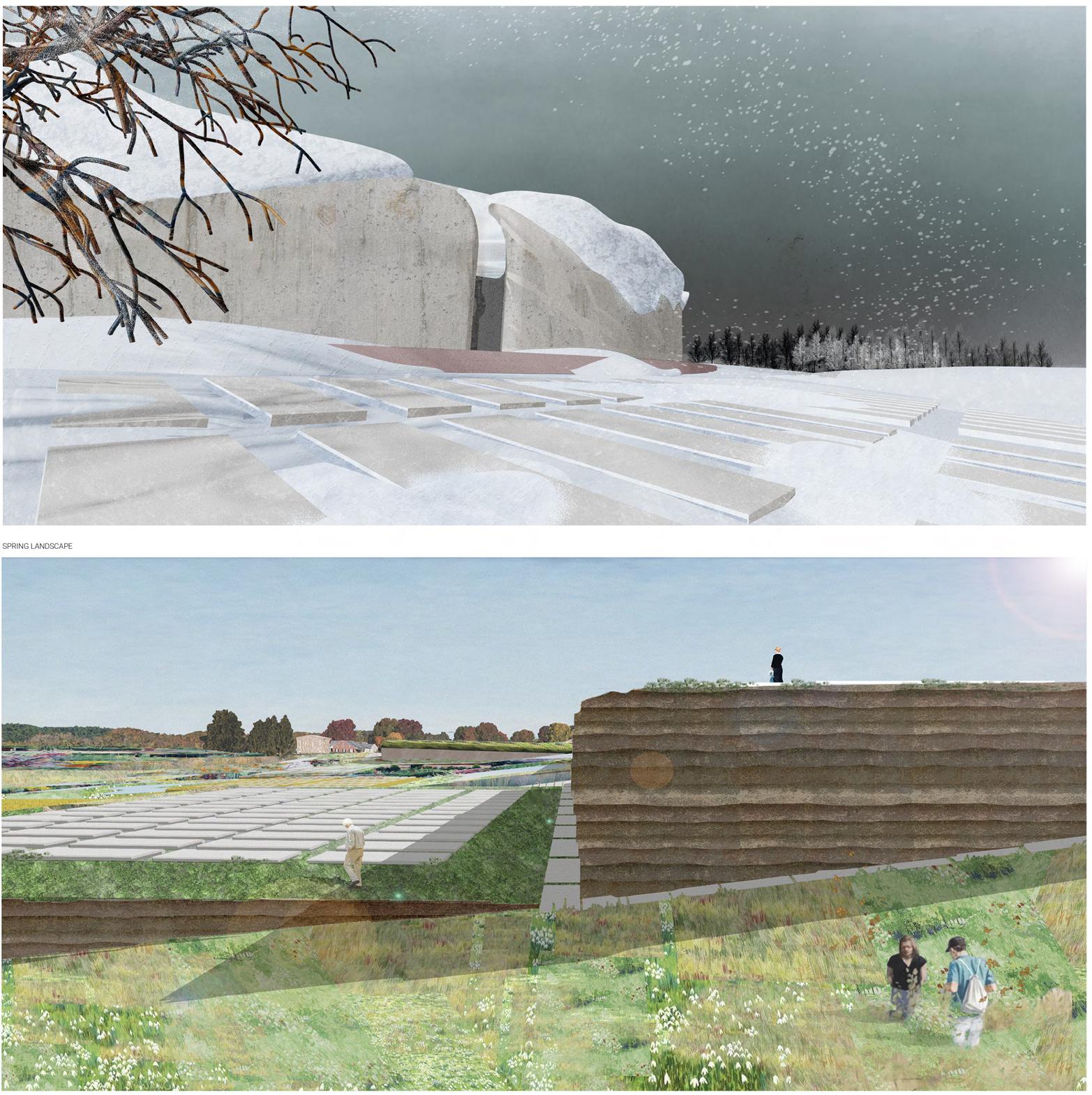 THE OBJECTIVE OF THIS BUILDING AND LANDSCAPE ORGANIZATION IS TO RESTORE ECOLOGY AND TO CREATE A SPACE FOR THE PUBLIC TO LEARN ABOUT NATURAL RESTORATION. BY SUPERIMPOSING A CEMETERY AND MEMORIAL WITHIN THIS URBAN FABRIC, IT HELPS HEAL THE CONTAMINATED SOIL AND CREATE A SPACE OF SIGNIFICANCE FOR THE CITIZENS OF VIENNA.