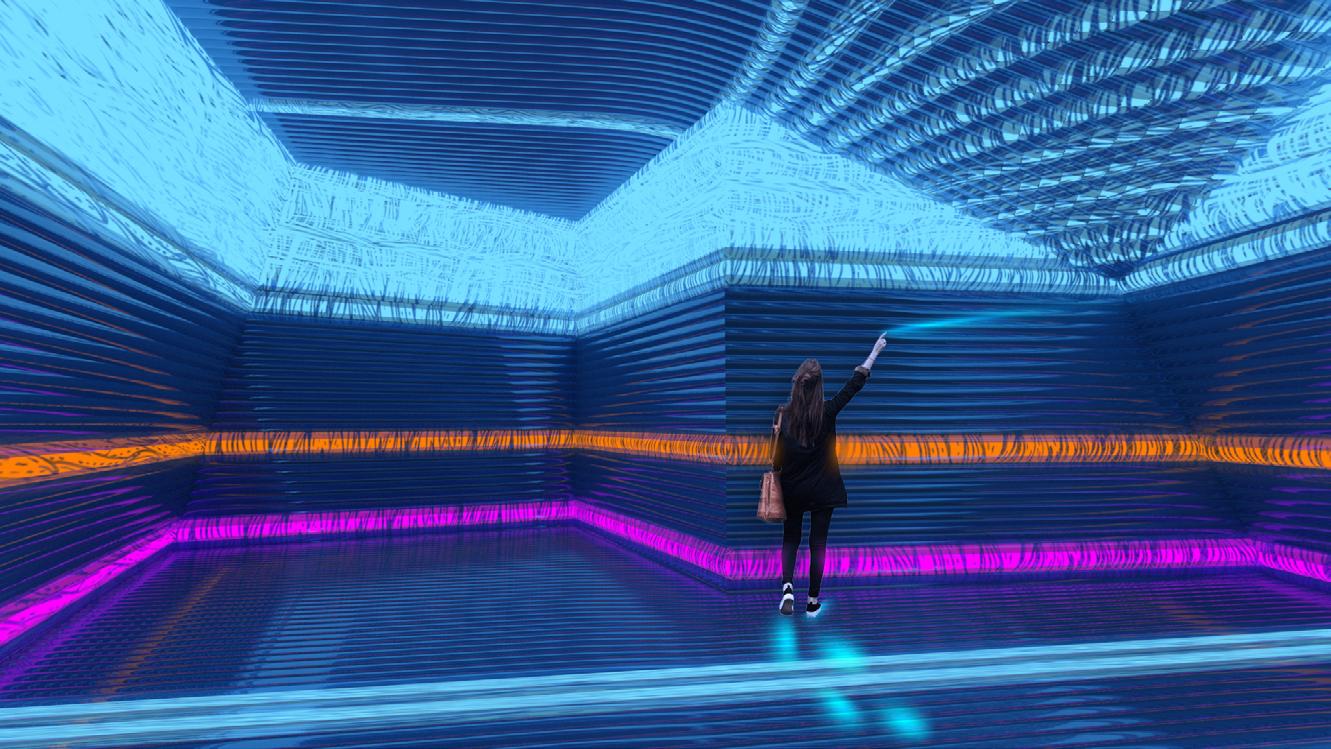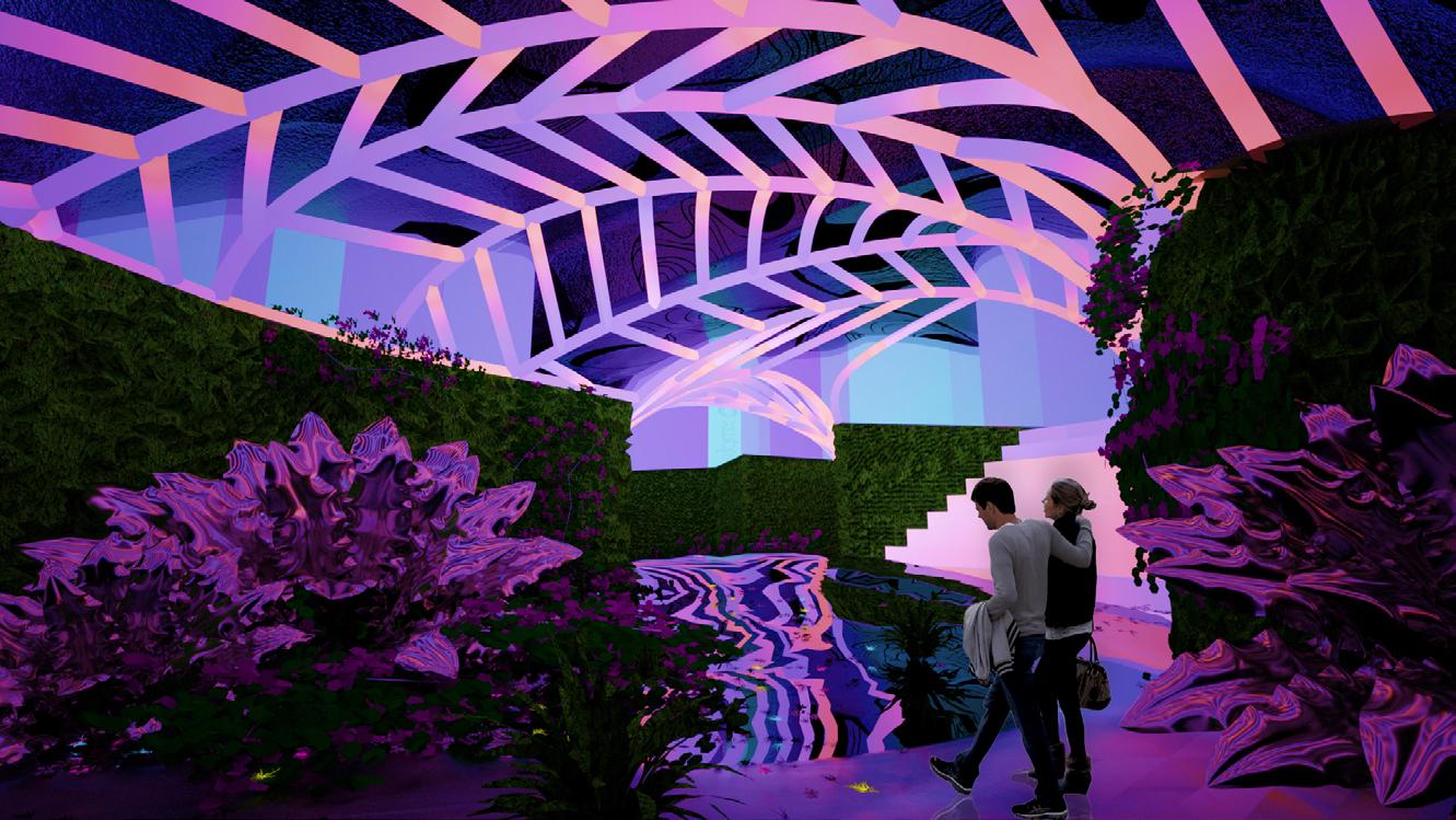 THE CONTEMPLATIVE PODS LOCATED OUTSIDE OF THE MAIN STRUCTURE ALLOW INDIVIDUALS TO CURATE THEIR OWN MEDITATIVE EXPERIENCE WHILE VISITING. EACH TYPE OF SPACE HOLDS PROGRAMS THAT RANGE IN PHYSICALITY AND EMOTION. THIS GIVES PEOPLE AUTONOMY TO DISCOVER WHAT “WELLNESS” MEANS TO THEM. OTHER IMPORTANT SPACES INCLUDE THE FRONT ENTRANCE THAT IS ENCAPSULATED BY A HOVERING CAGE-LIKE STRUCTURE----MIMICKING THE EXTERIOR SHAPE OF THE BUILDING AT A SMALLER SCALE----AND THE OPEN AIR AUDITORIUM THAT BRIDGES THE GAP BETWEEN THE CITY AND THE PROGRAMS HELD INSIDE.