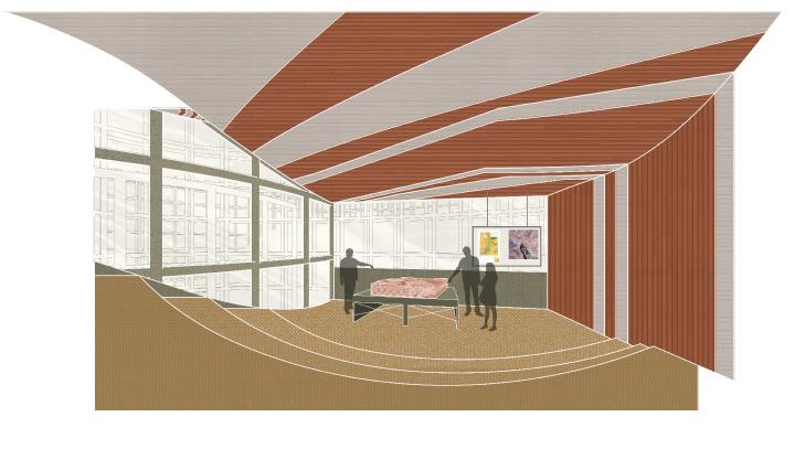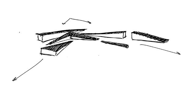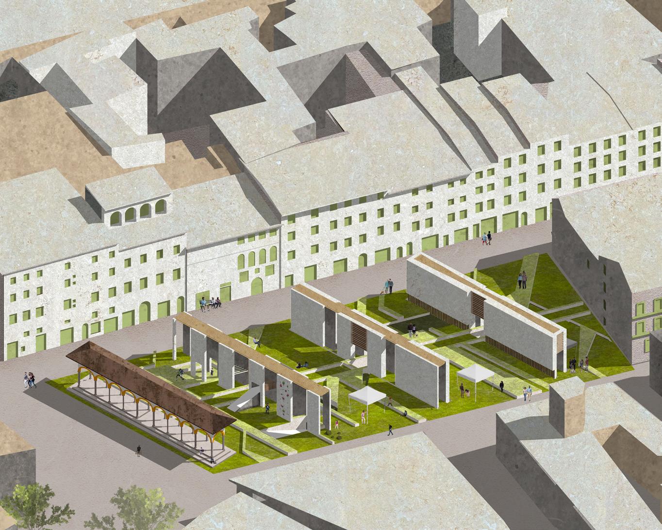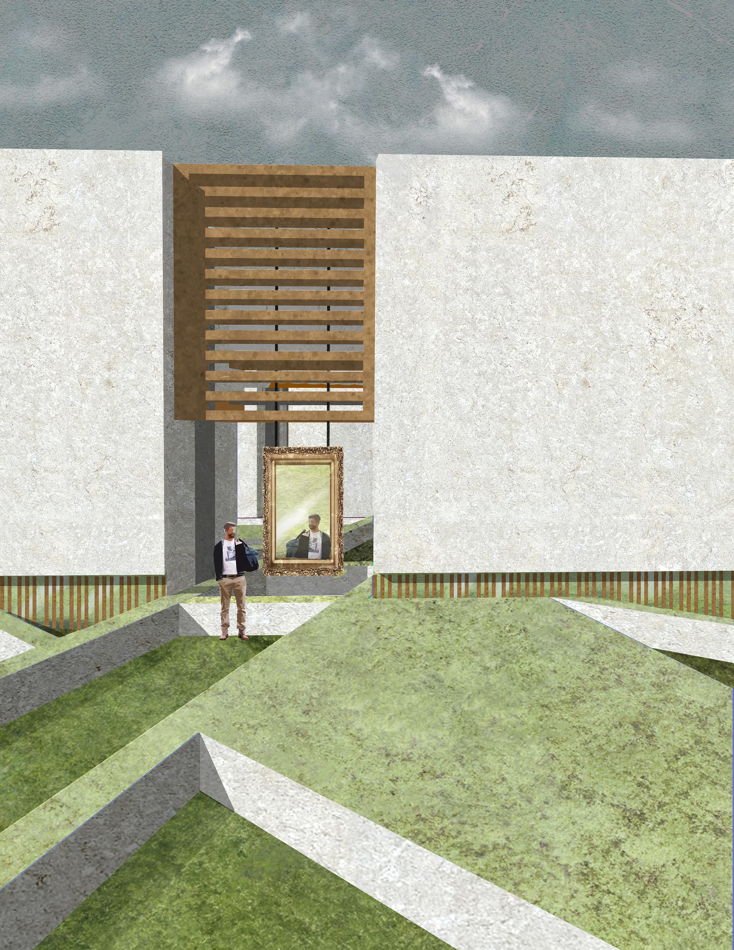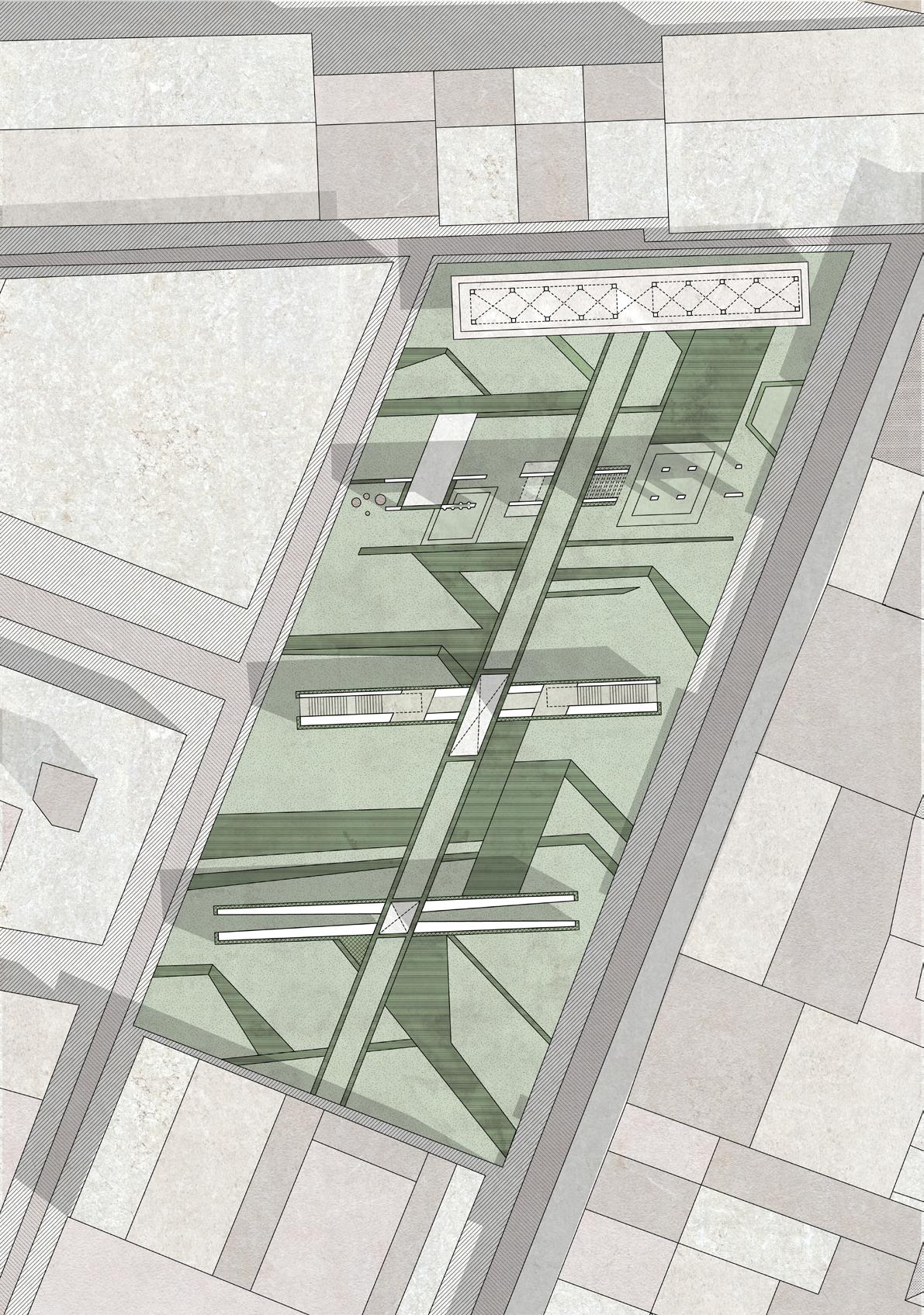 LOCATED ON A HISTORIC AND HIGHLY PUBLIC AREA, THIS DESIGN CATERS TO THE COMMUNITY NEED FOR GREEN SPACE AND MULTIPURPOSE AREAS. USING THREE MAIN BLADES PROJECTING FROM UNDERNEATH THE GROUND, THE EXISTING URBAN LAYOUT BECOMES INTERRUPTED. THIS ALLOWS FOR A NEW LOGIC CONCERNING PEDESTRIAN MOVEMENT AND BRIDGES THE GAP BETWEEN DEMOGRAPHICS, SUCH AS TOURISTS AND RESIDENTS.
