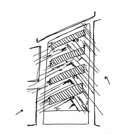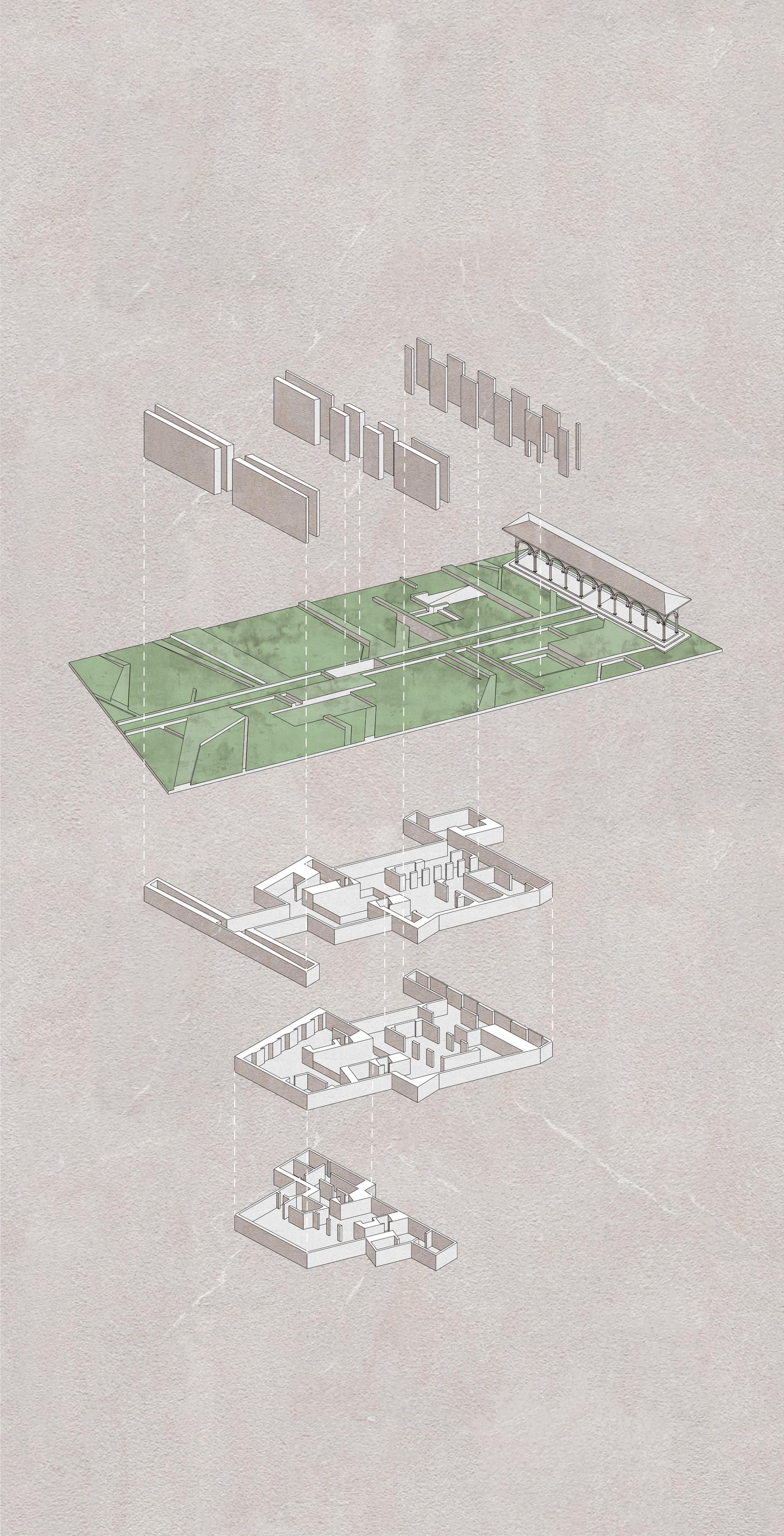 AN IMPORTANT CONCEPT OF THIS PROJECT IS THE IDEA OF PERMEABLE BARRIERS AND THE SOLID VS VOID RELATIONSHIP. THE ARCHETYPE OF A LOGGIA SUGGESTS A STRUCTURE OF PURE VOID, WITH ONLY A ROOF AND ARCHES TO CREATE SPACE. A REFLECTION OF THIS IDEA IS SEEN WITHIN THE PLAN OF THE THREE BLADES. AS ONE MOVES NORTH TO SOUTH THROUGH THE SITE, SLOWLY THE STRUCTURES BECOME MORE SOLID, GENERATING A HEAVIER MASS THROUGH WHICH TO PROCEED. EVENTUALLY, THE BLADES BEGIN TO DIGRESS FROM THE LOGGIA ARCHETYPE AND BECOME A MORE SOLID STRUCTURE.