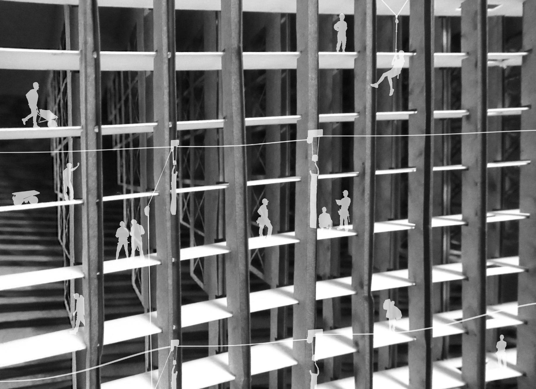 AN IMPORTANT CONCEPT OF THIS PROJECT IS THE IDEA OF ACCESSIBILITY. THE STRUCTURAL ELEMENTS WITHIN THIS DESIGN ALLOWS FOR WORKERS TO DESCEND THE CANYON NOT ONLY FROM THE MAIN SPIRALING FORM BUT ALSO THE EXTERIOR SCAFFOLDING. PEOPLE OCCUPYING THIS SPACE CAN REACH FROM ONE LEVEL TO ANOTHER BY UNIFORM RAMPS DISPERSED ALONG THE SPIRAL. THE IMAGE TO THE RIGHT IS A PHYSICAL MODEL OF THIS SYSTEM AND A HYPOTHETICAL REPRESENTATION OF HOW THIS STRUCTURAL ELEMENT CAN BE USED.
