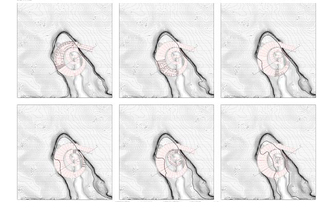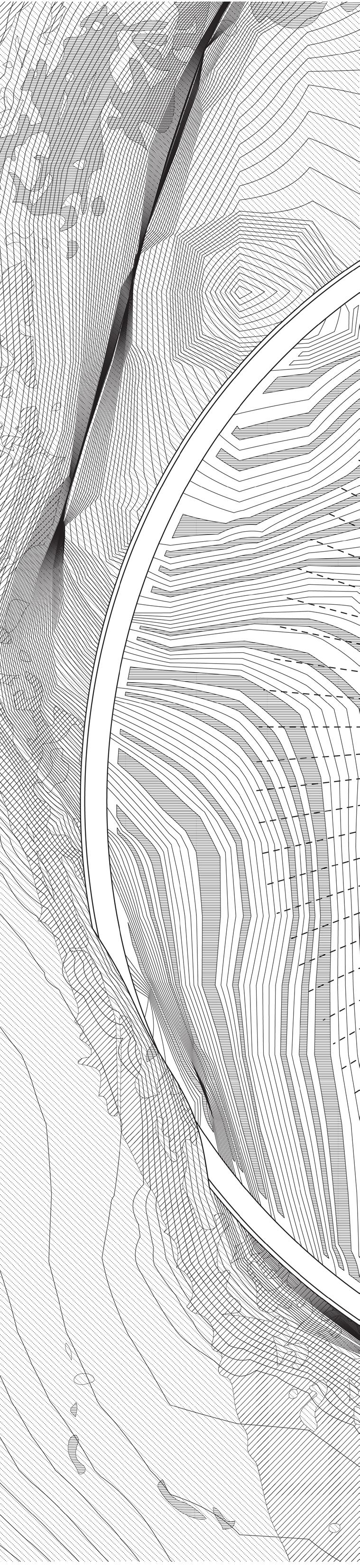 THE DEVELOPMENT OF THE SCAFFOLDING SYSTEM STEMS FROM A SERIES OF PRECEDENT STUDIES. A COMBINATION OF TWO SETS OF DRAWING TECHNIQUES PRODUCED A SPIRAL SHAPE. THIS SPIRAL GENERATES THE SCAFFOLDING SYSTEM THAT SUPPORTS THE BUILDING LOADS AND NATURALLY OCCURRING WIND LOADS. THE UNIQUENESS OF THIS SYSTEM IS IN IT’S CIRCULAR SHAPE AND ABILITY TO HOLD ECOLOGY PODS. THESE SMALL SCALE OBJECTS CAN BE USED AS CONTROLLED ENVIRONMENTS FOR LAB WORKERS TO MONITOR SOIL SAMPLES.