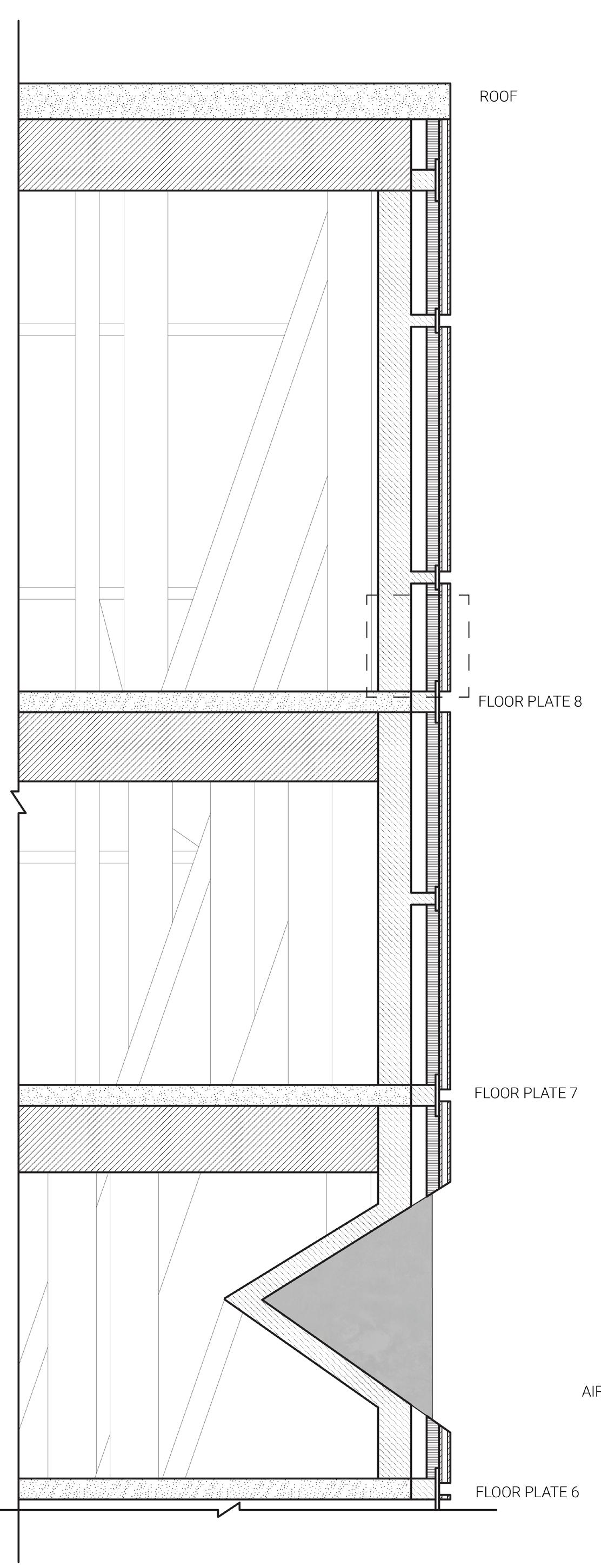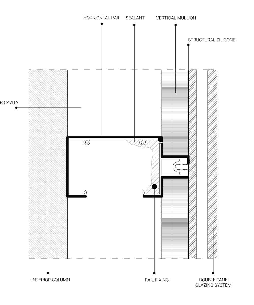 DUE TO THE NATURE OF THIS CURTAIN WALL SYSTEM, MOST OF THE FACADE UTILIZES A UNITIZED CURTAIN WALL SYSTEM. THESE COMPONENTS ARE ASSEMBLED IN THE FACTORY THEN BROUGHT TO THE SITE. THIS IS THE MOST EFFECTIVE SYSTEM FOR THE BUILDING’S SIZE, HOWEVER SOME PANELS—LIKE THE DIAGONAL SAWTOOTH ELEMENTS —MAY NEED TO BE ASSEMBLED IN THE FIELD. THIS IS DUE TO THEIR UNIQUE SHAPES AND ANGULAR CONNECTIONS, MAKING IT DIFFICULT TO STANDARDIZE. EACH PART OF THIS CURTAIN WALL SPANS FROM ONE FLOOR SLAB TO ANOTHER, YET INCLUDES FIRE-STOPPING METHODS THAT MAINTAINS THE STRUCTURE’S FIRE SAFETY.