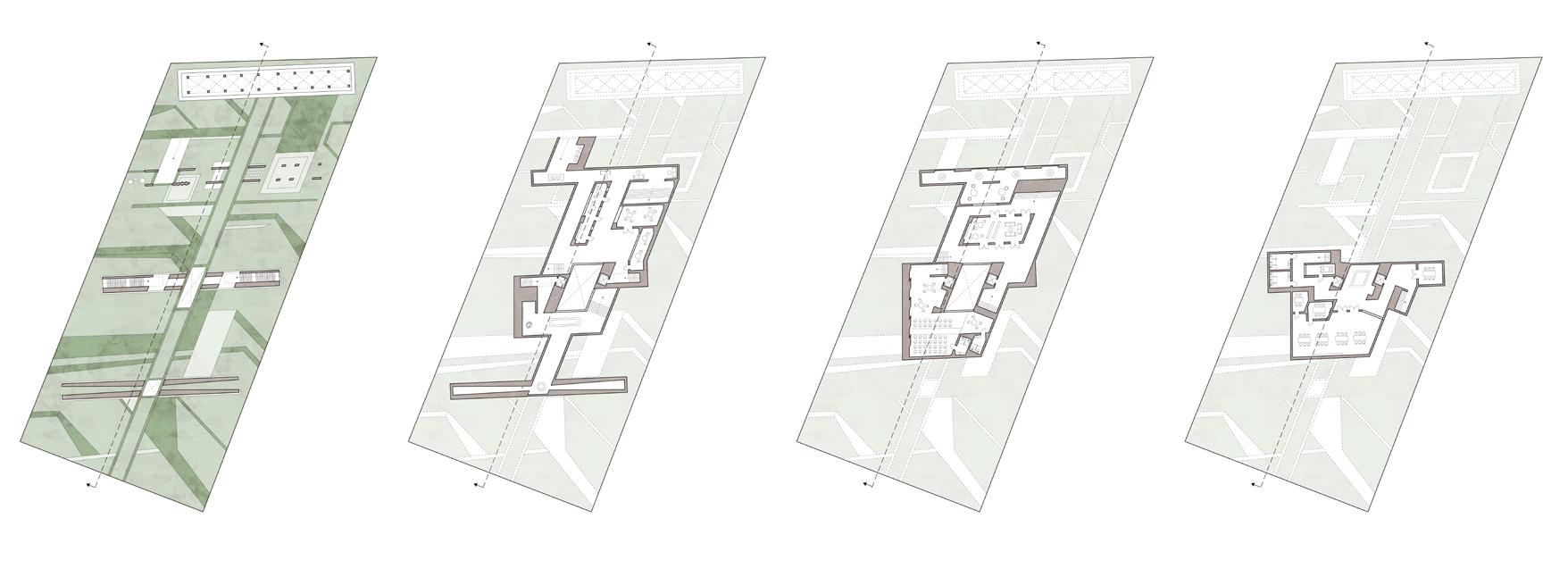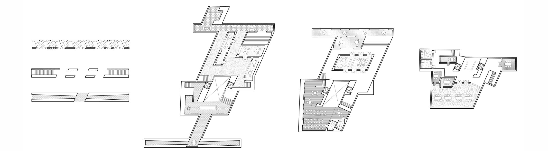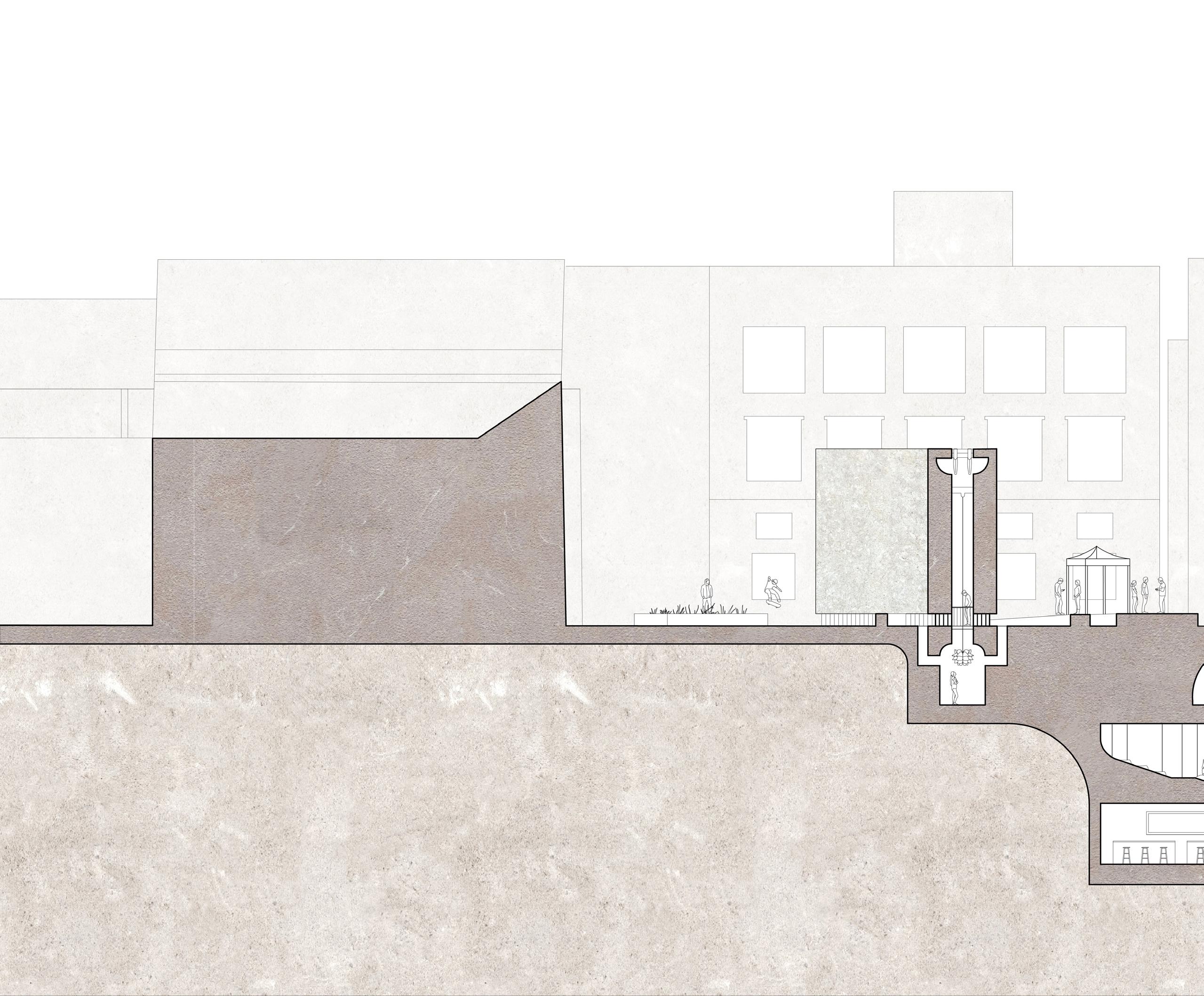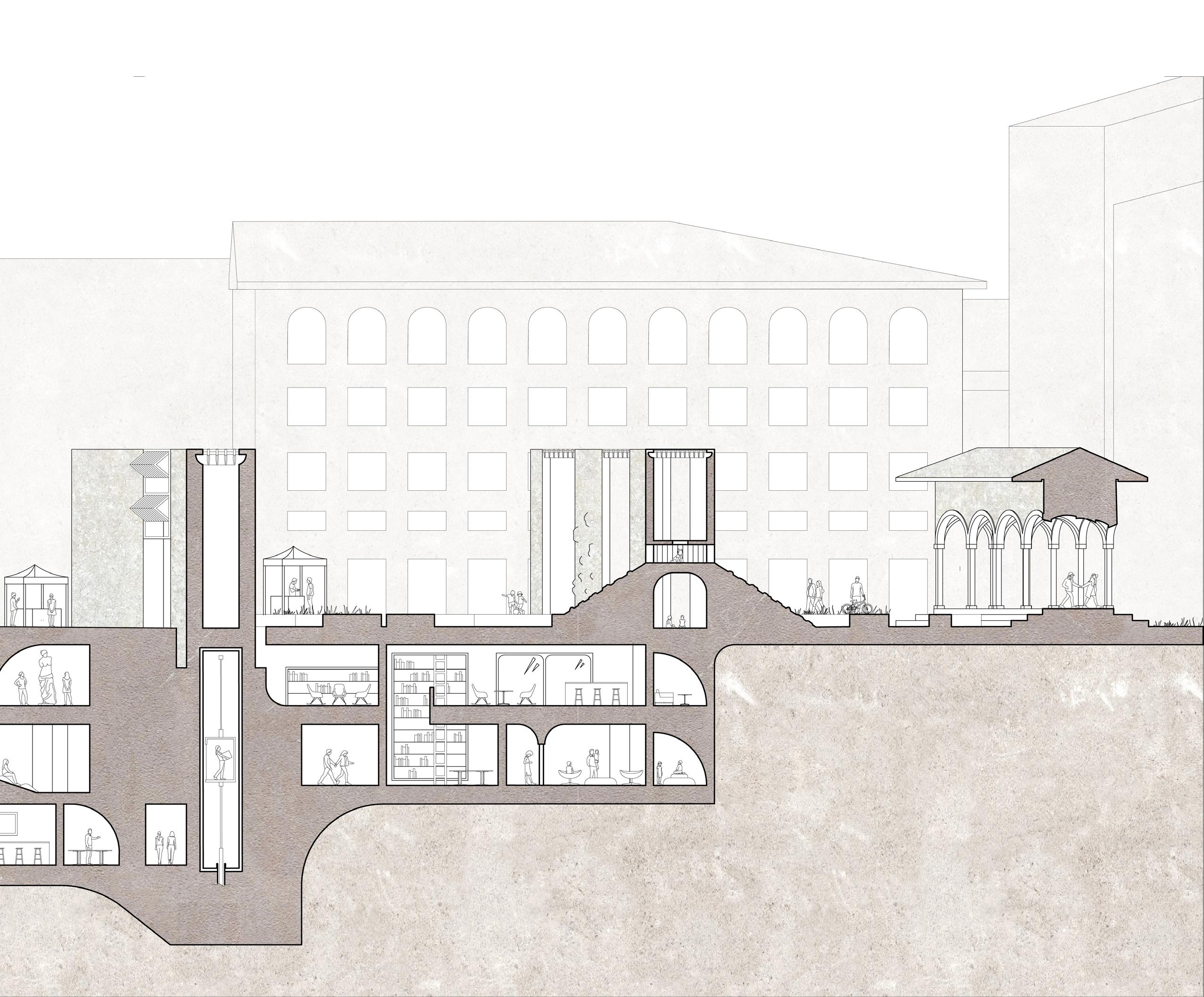 A HIGHLY ARTICULATED LANDSCAPE AGAINST A SERIES OF SIMPLE FACES COMPOSES SPACE FOR COMMUNITY EVENTS TO OCCUR LIKE THE WEEKLY FLEA MARKETS, SOCCER MATCHES AMONGST FLORENCE RESIDENTS, AND SIMPLE WALKS FROM ONE SIDE OF THE SITE TO THE OTHER. A SINGLE FORCED PERSPECTIVE STARTING FROM THE NORTHERN PART OF THE SITE, EXTENDS FROM LOGGIA DEL PESCE. THIS MOVE UNITES THE LANDSCAPE EXTRUSIONS AND ALL THREE BLADES INTO ONE SINGULAR PATH. ADDITIONAL LATITUDINAL ENTRANCES ARE PLACED WITHIN THE BLADES TO ACCESS THE THREE UNDERGROUND FLOORS BENEATH THE CURATED PIAZZA.