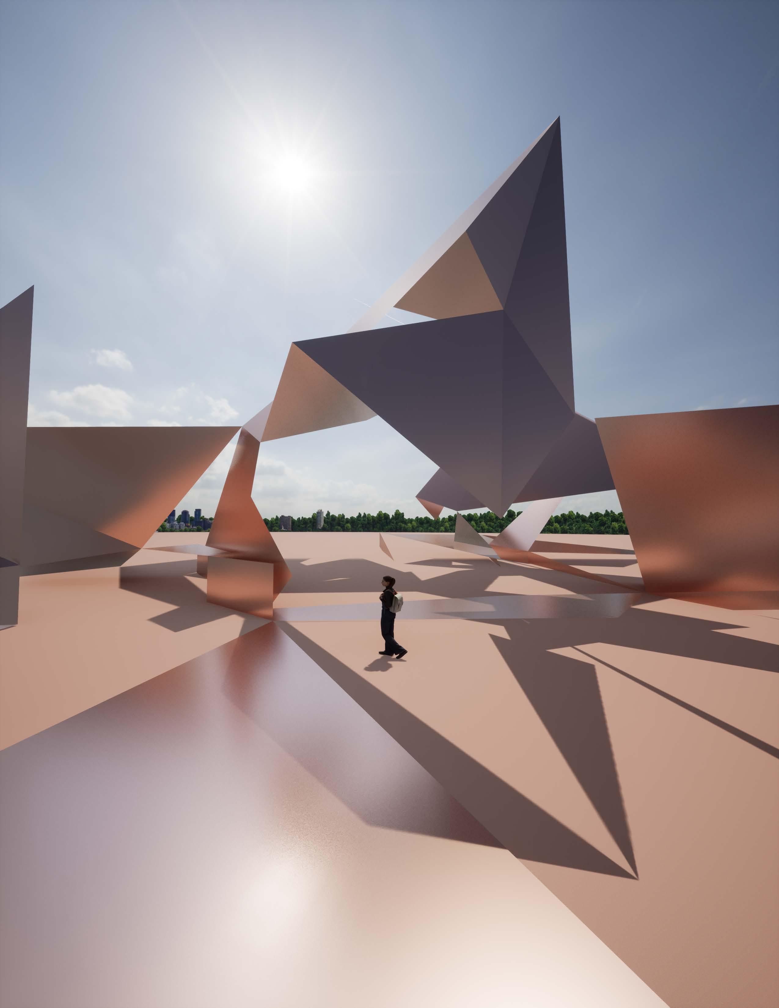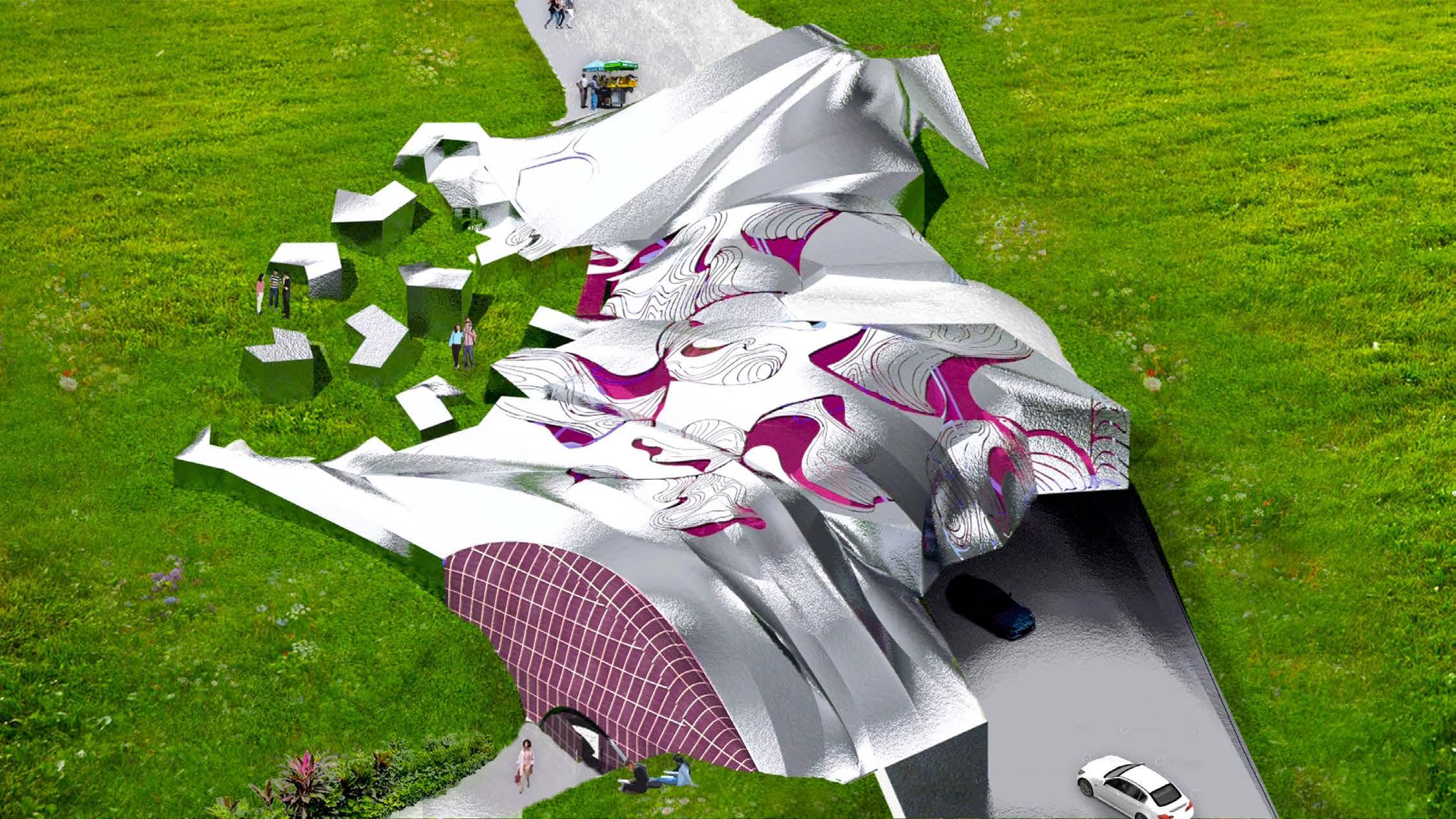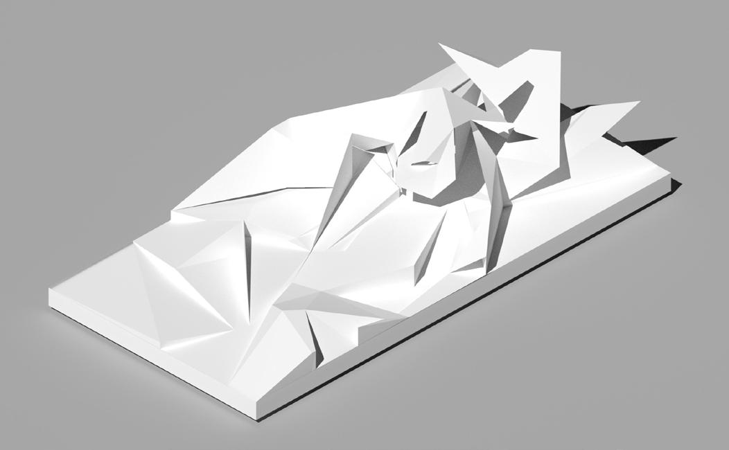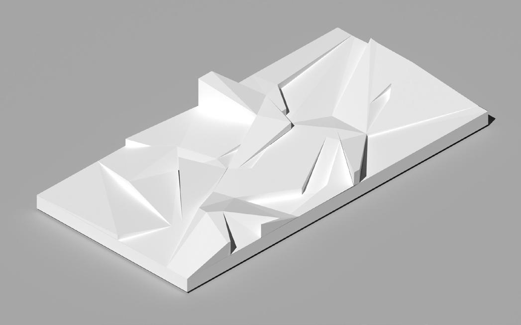 Dueling geometries---the curves of the natural pods and the folded planes of the synthetic landscape---can coexist. One form can influence the placement, elavation, and walkable path of the other.