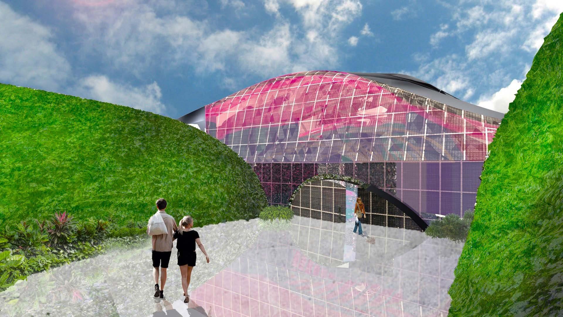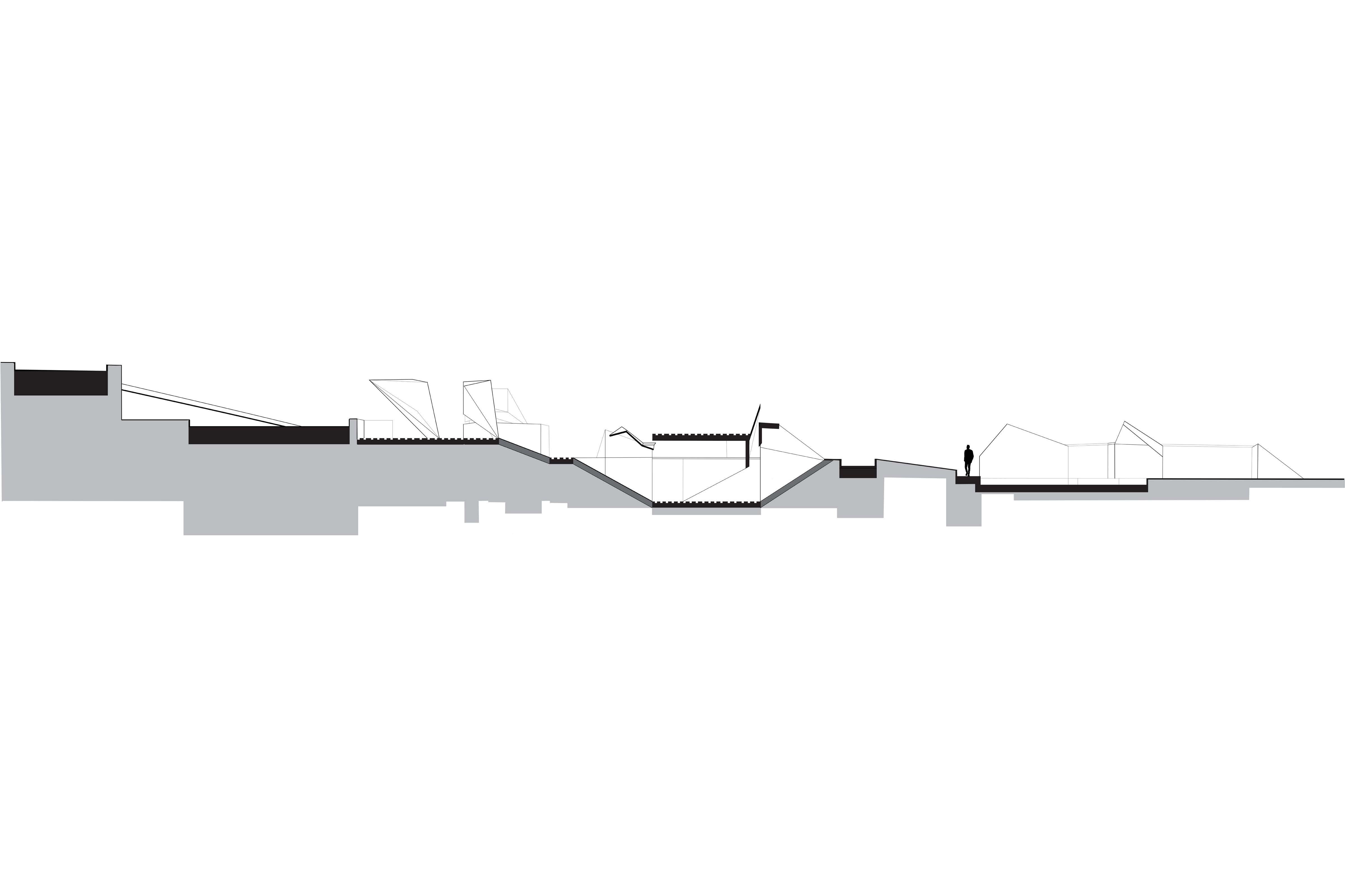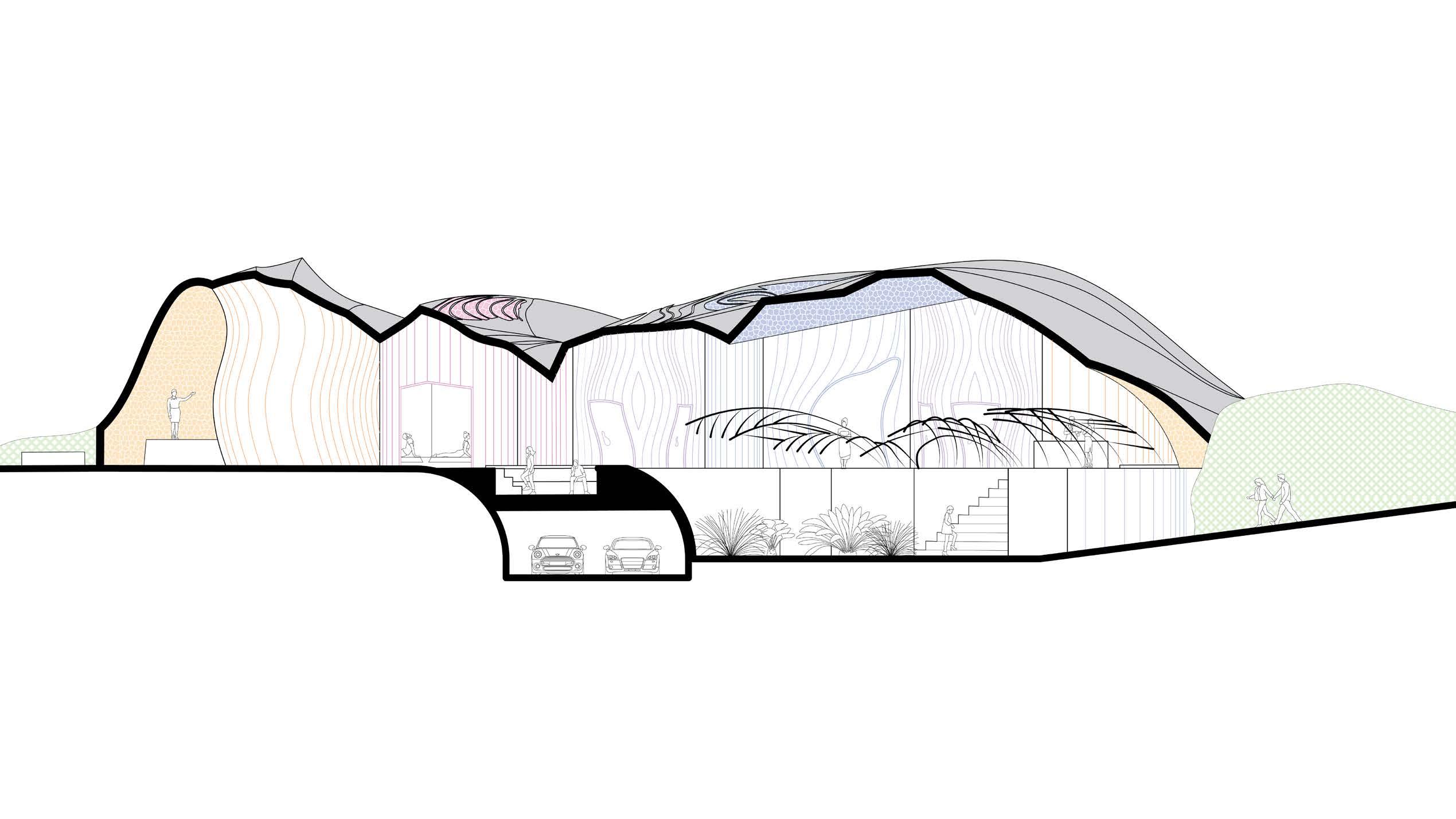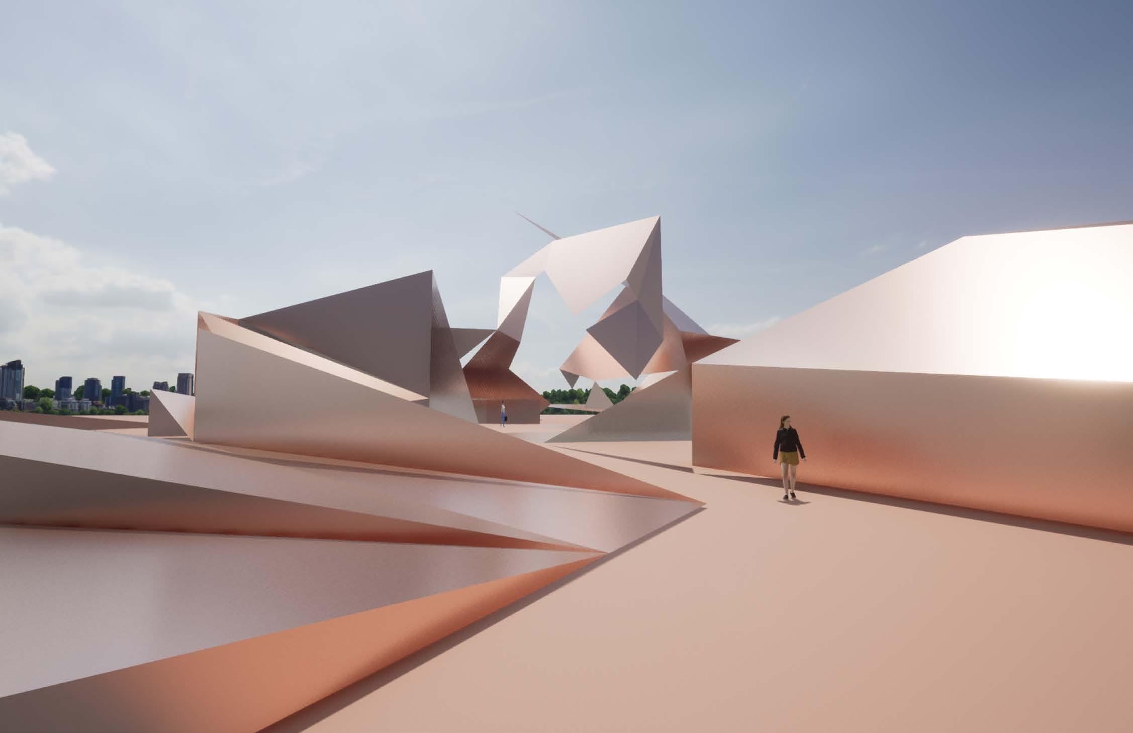 Dueling geometries---the curves of the natural pods and the folded planes of the synthetic landscape---can coexist. One form can influence the placement, elavation, and walkable path of the other.