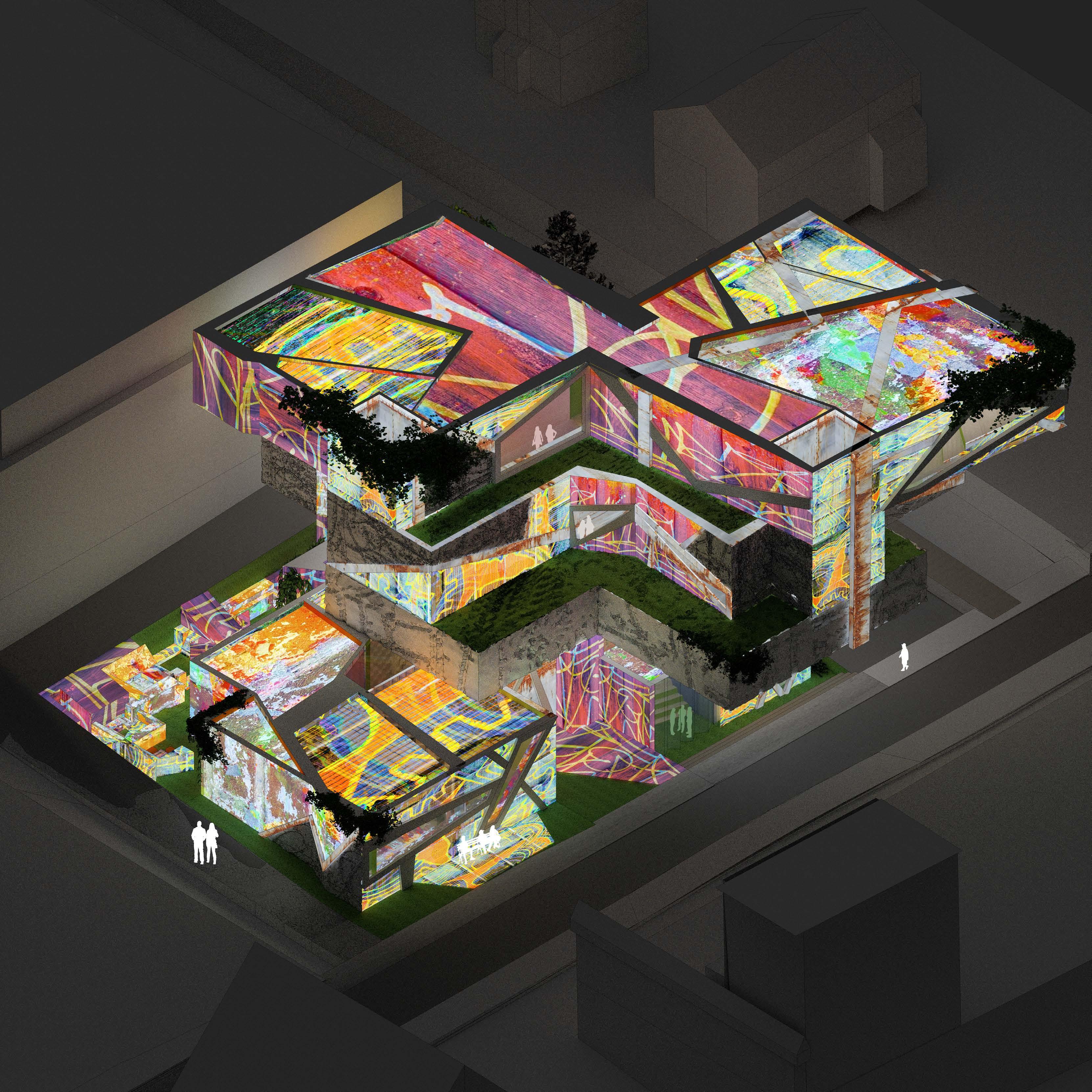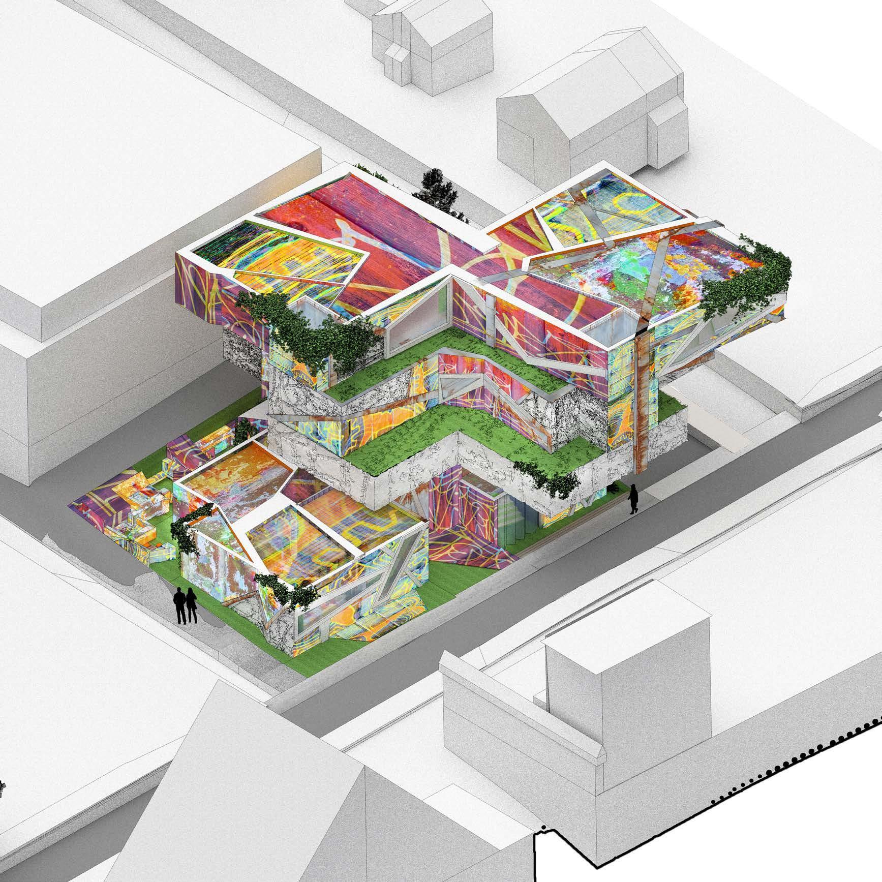 Allow the qualities of my art---limitless worlds, colorful palettes, underlying stories---to seep into the rigid demand of building program types. Both practices allow me to take ideas from my mind and simply create something that didn’t exist before.