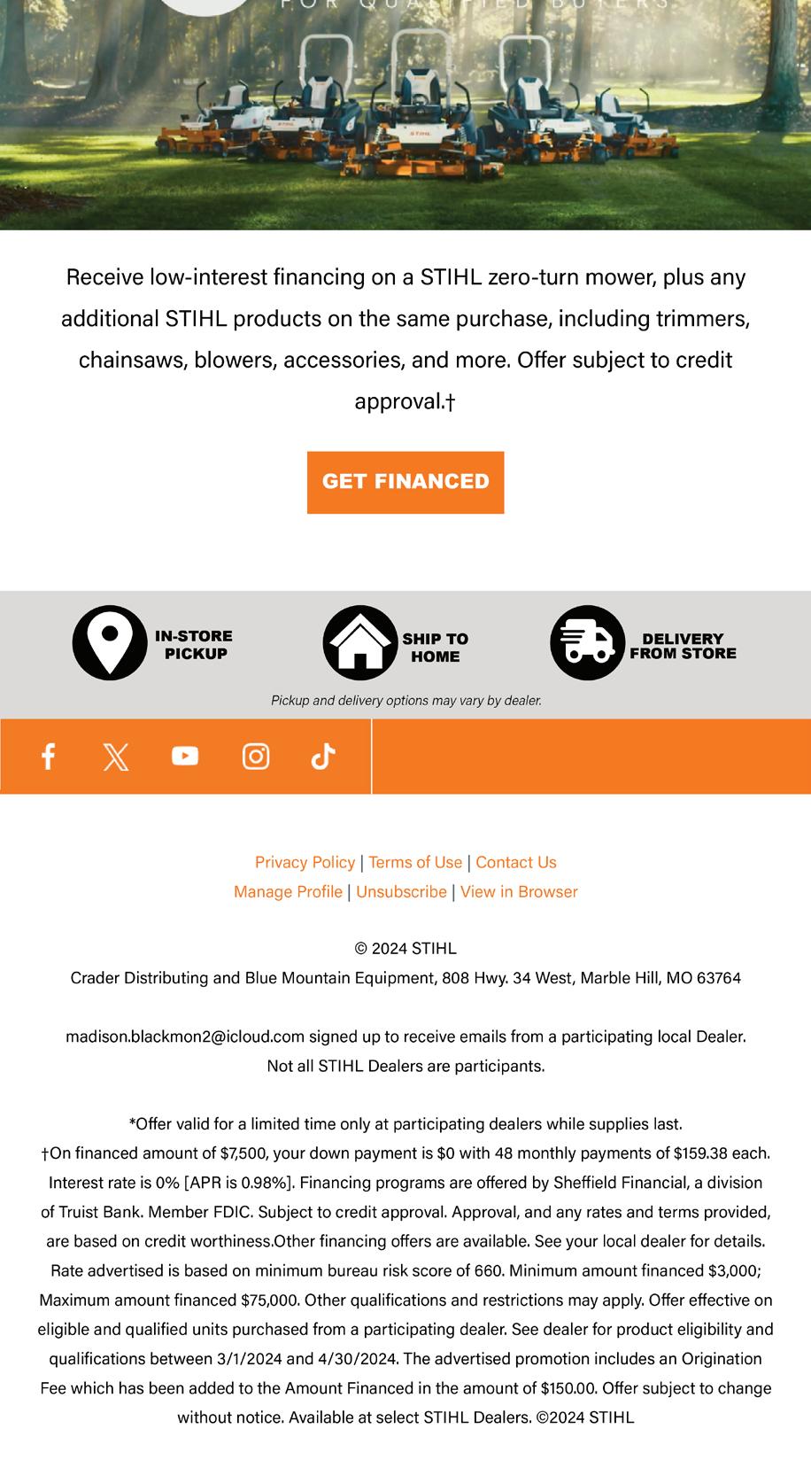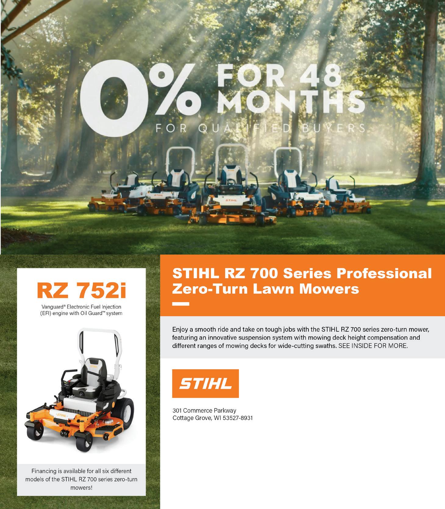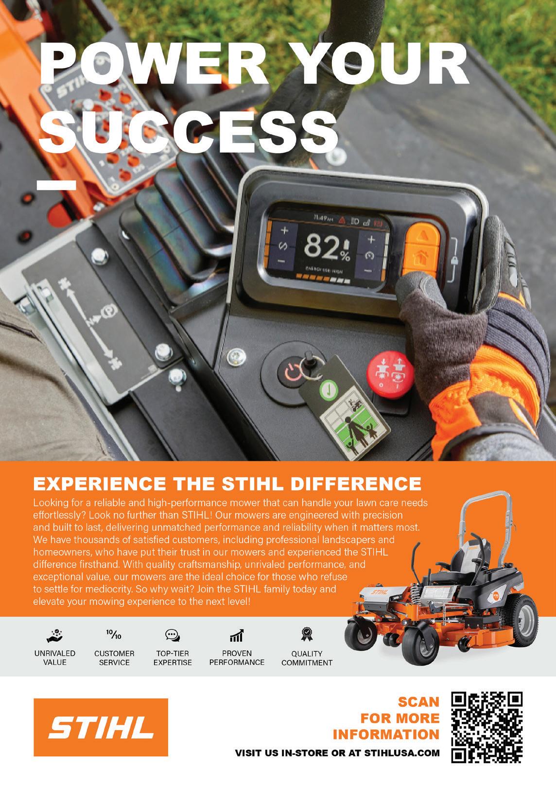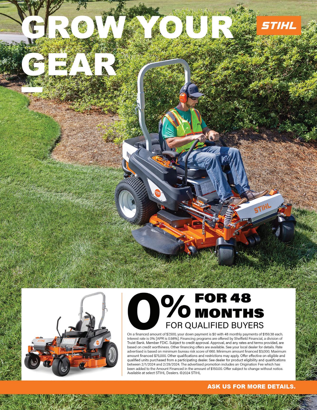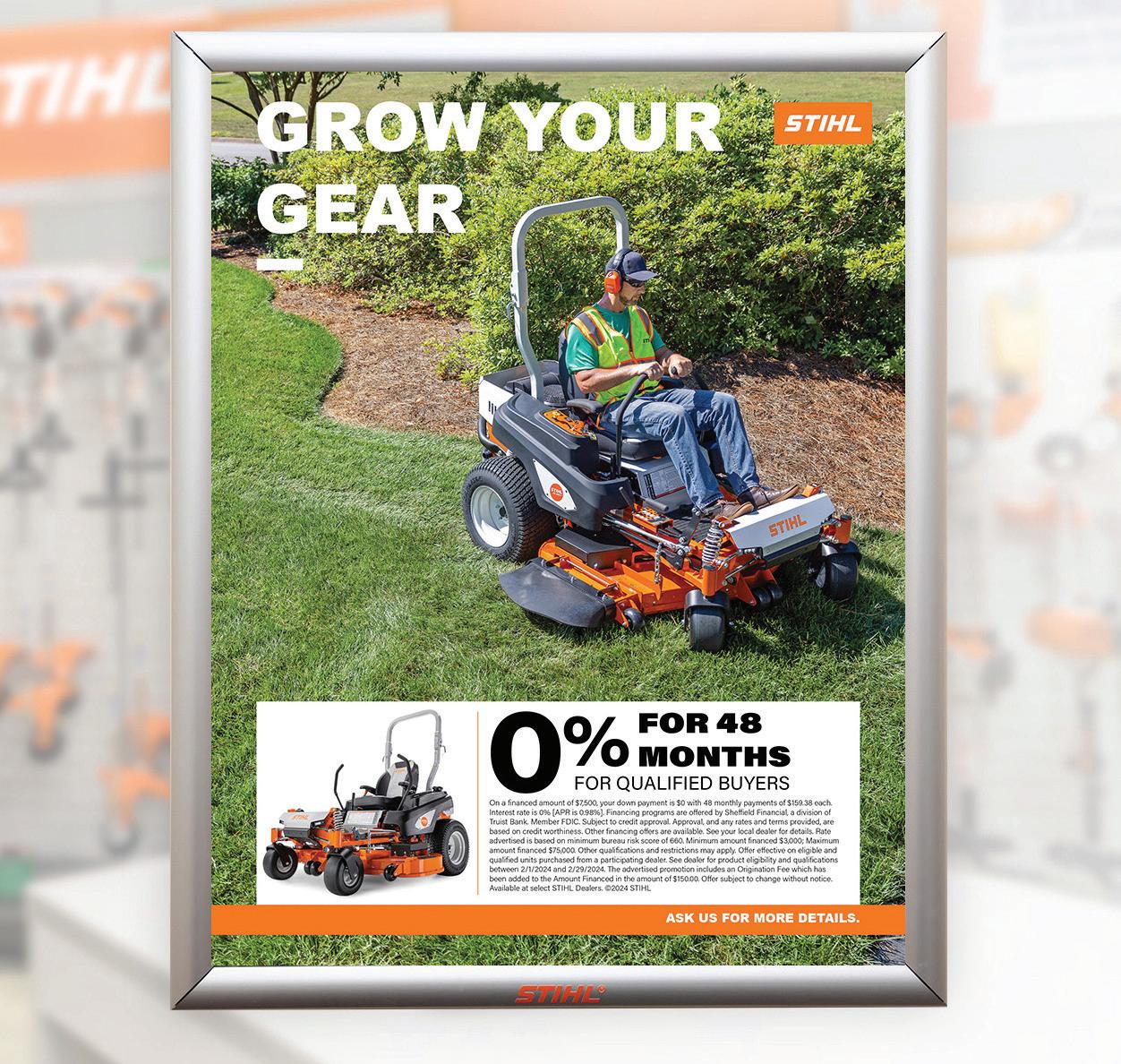 GROW YOUR GEAR SCAN THE QR CODE FOR MORE INFORMATION On a financed amount of $7,500, your down payment is $0 with 48 monthly payments of $159.38 each. Interest rate is 0% [APR is 0.98%]. Financing programs are offered by Sheffield Financial, a division of Truist Bank. Member FDIC. Subject to credit approval. Approval, and any rates and terms provided, are based on credit worthiness.Other financing offers are available. See your local dealer for details. Rate advertised is based on minimum bureau risk score of 660. Minimum amount financed $3,000; Maximum amount financed $75,000. Other qualifications and restrictions may apply. Offer effective on eligible and qualified units purchased from a participating dealer. See dealer for product eligibility and qualifications between 2/1/2024 and 2/29/2024. The advertised promotion includes an Origination Fee which has been added to the Amount Financed in the amount of $150.00. Offer subject to change without notice. Available at select STIHL Dealers. ©2024 STIHL 0 FOR 48 MONTHS FOR QUALIFIED BUYERS % VISIT US IN-STORE OR ONLINE AT STIHLUSA.COM