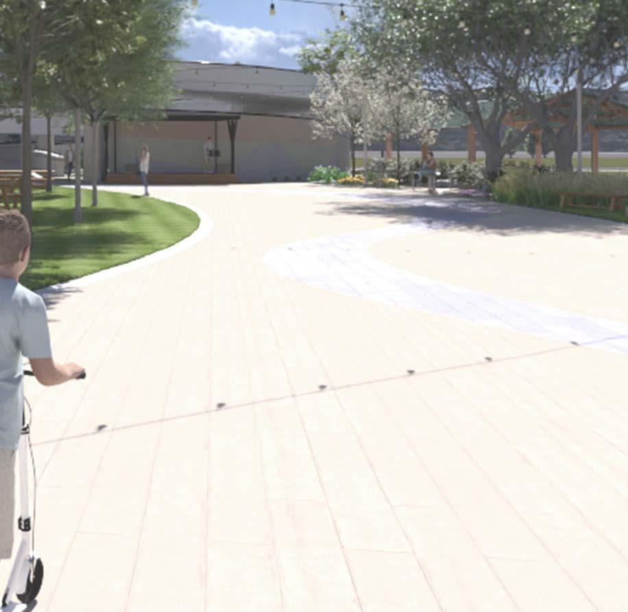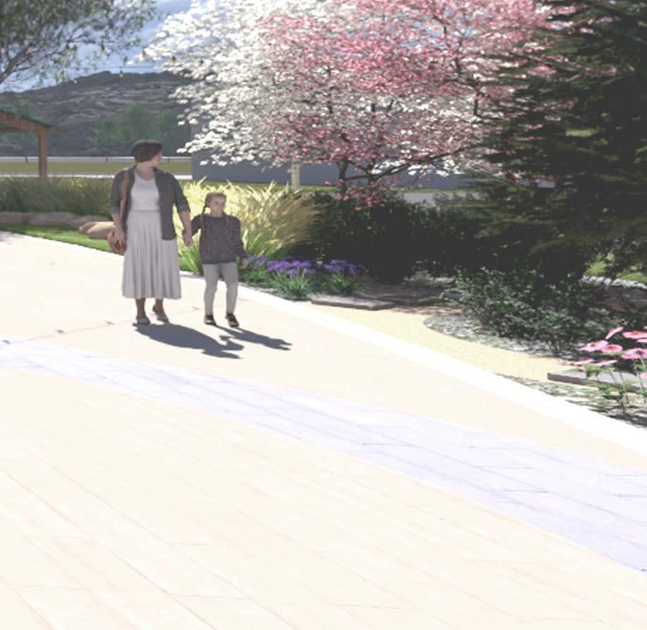 The new plaza design features a custom pergola above a stage for outdoor concerts in the summer. Additionally, we provided a large specimen evergreen at the corner of 7th and Main Streets for Silt’s famous Christmas celebration and parade. Across from the tree is a custom iron-inlay fire pit by Breck Ironworks. Moving east, a seat wall divides the plaza from the neighboring property and increases an opportunity to rest alongside picnic tables on the Bermuda grass lawn. Across the paved plaza, large granite boulders may be used for seating or play. A custom paving pattern design mimics the meander of the Colorado river which can be found by crossing the bridge via the pedestrian ramp.