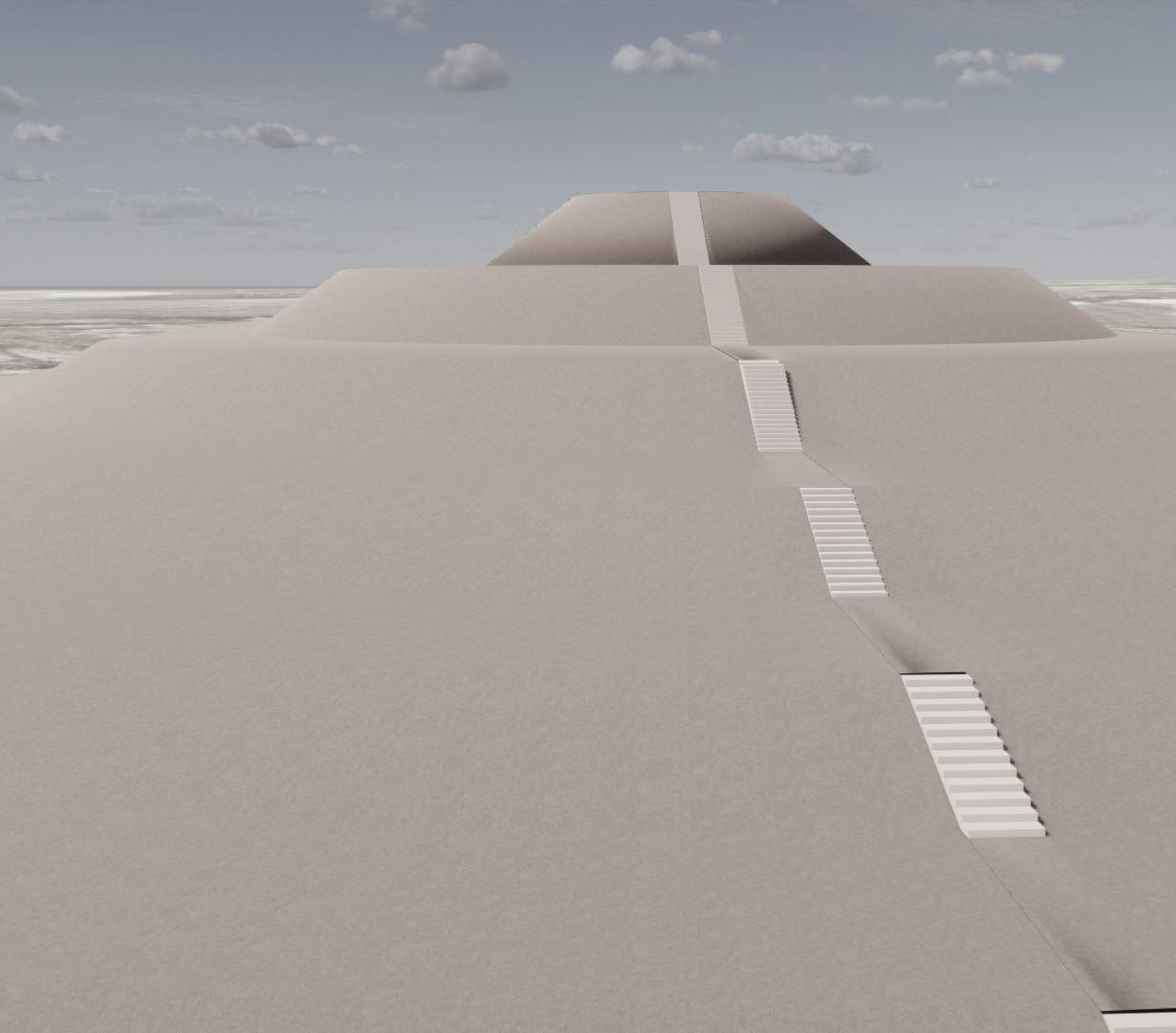 Environmental Harms: Mining - The proposed form of this art piece is a mound exactly one mile from the drying salt beds that remain from the potash mining that took place on Sevier Lake before our team arrived. The looming 240’ mound creates an earth viewing platform for the changes on the lake bed. It is made up of the dirt from the building of nearby features including material from adjacent mining and recreation sites.