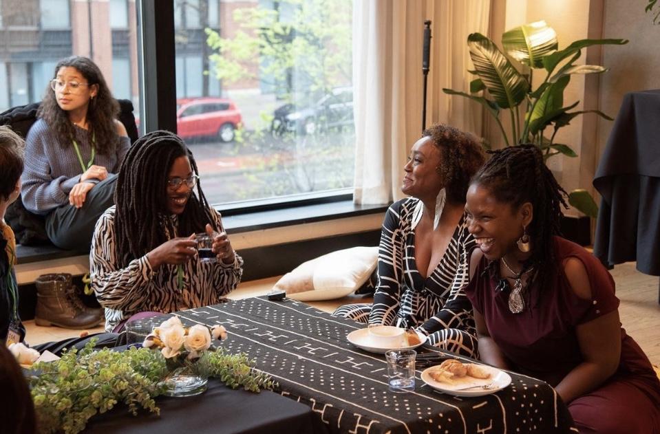 The symposium was an atmosphere to simply exist in a designed experience We were provided the chance to heal our spirits, re-imagine art-making and curating for new-world-building as well as reconvene in an intimate social gathering after an unimaginable global pandemic The action packed weekend provided everyone the opportunity to mingle and engage with so many people; maybe not by former standards, however we had not been around that many people in terms of quantity and duration for years We normally hustle and bustle around between jobs, errands and art shows so to sit and gather at a full length weekend symposium really allowed for deep connections to form as we knew we would see one another again soon and pick back up where we left off The level of sustained kindness and consideration afforded to strangers that we would soon speak to permitted behavior like smiling across the room at someone or in the Eaton DC lobby area recognizing the fact that we both wore the symposium name tags I knew in a sense that I was safe to be vulnerable with the other name tag wearer’s’ presence even if I had not talked to that person yet because the container of this space has essentially created a tribe, as one person had called it, that allowed us to trust everyone in the group as we trusted the network of people Therefore I could be brave in my hellos and smiles and sharing of personal stories as the people I know and cherish know and cherish this person- even if I have yet to meet them This rapid development of a rich social fabric really made this event so successful.