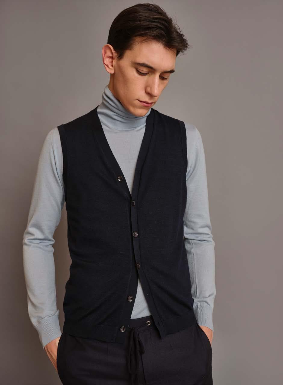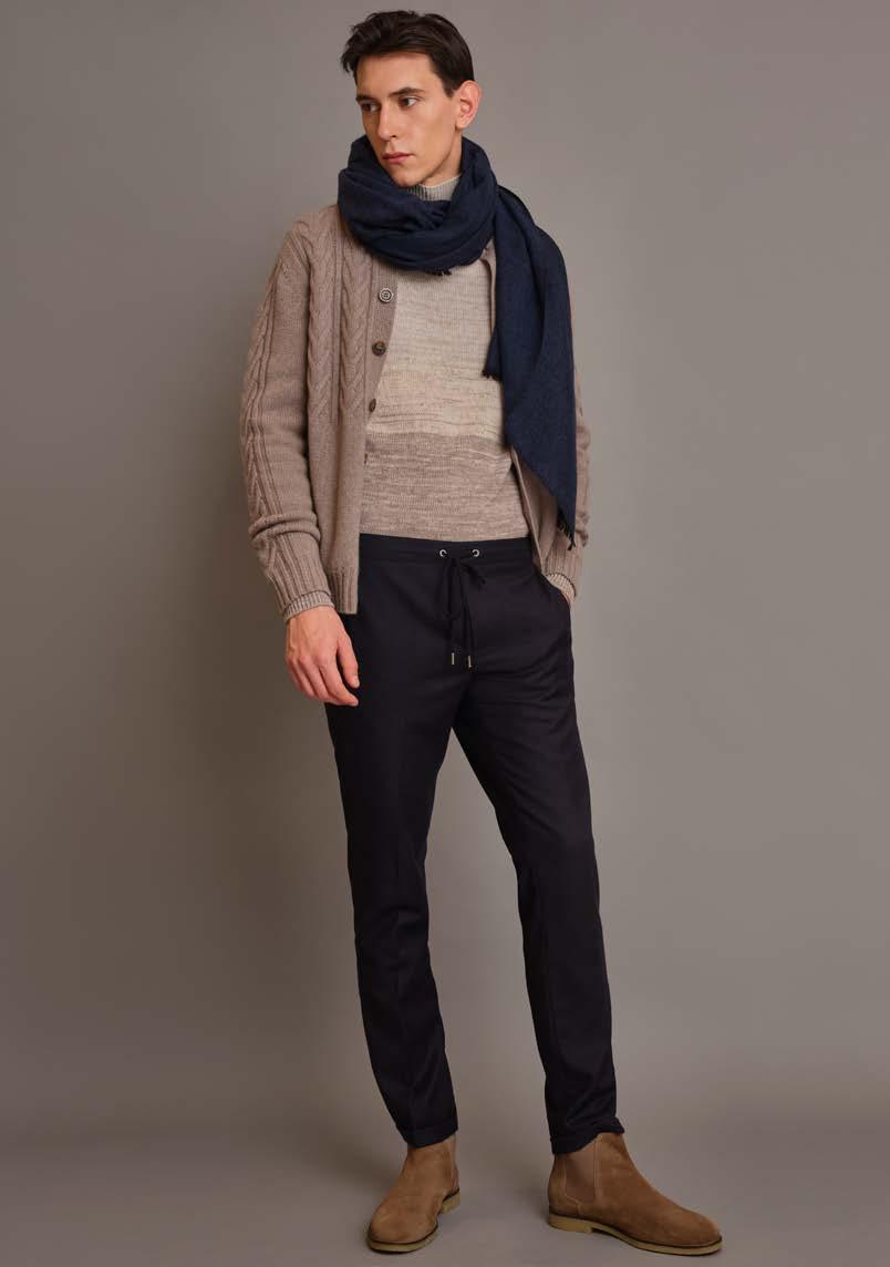 Turtleneck gilet with rhombus embroideries Basic mock neck in lightweight cashmere Chino pants in flannel with silk details