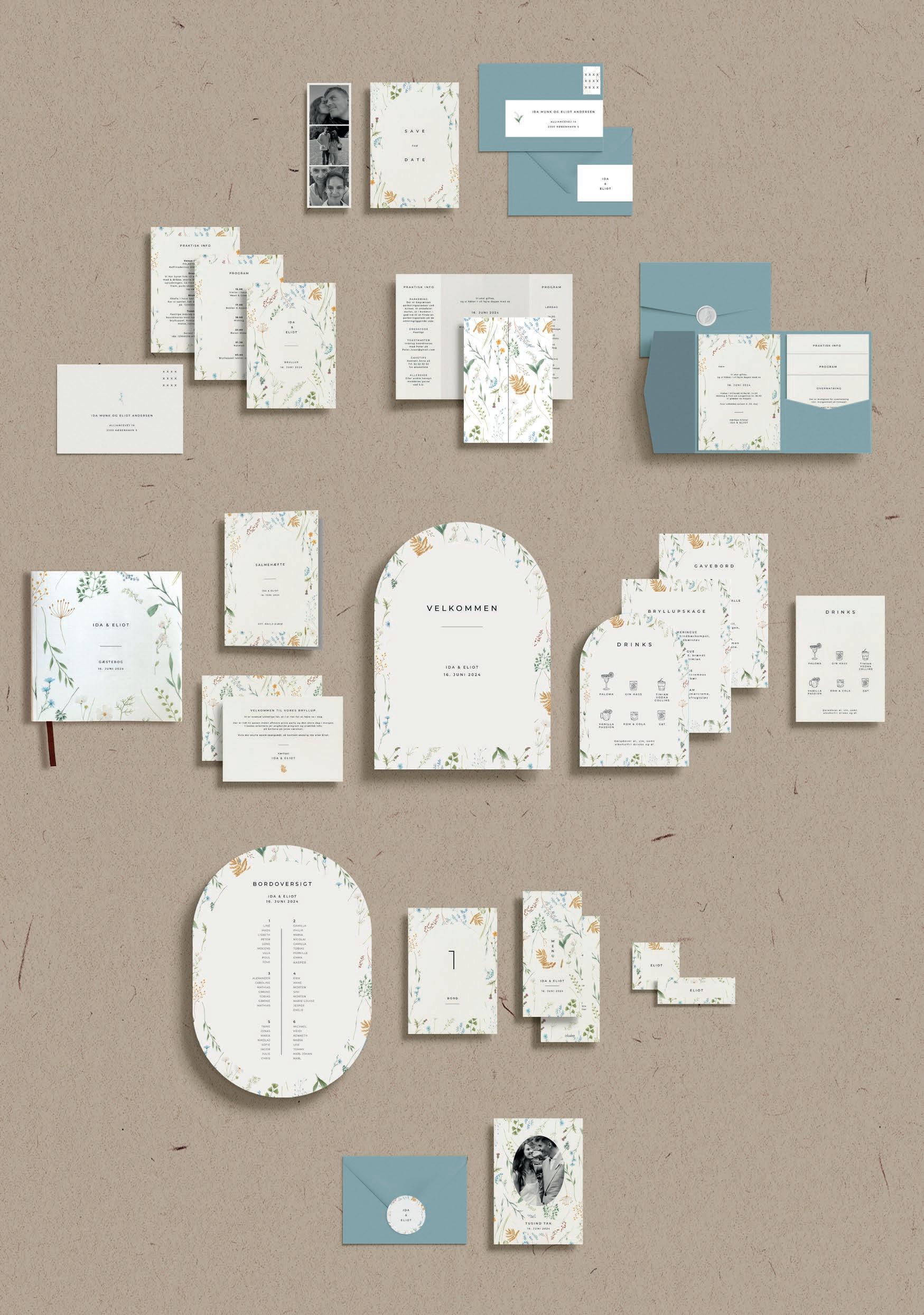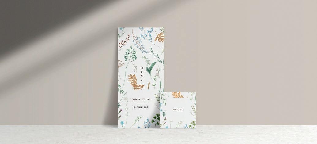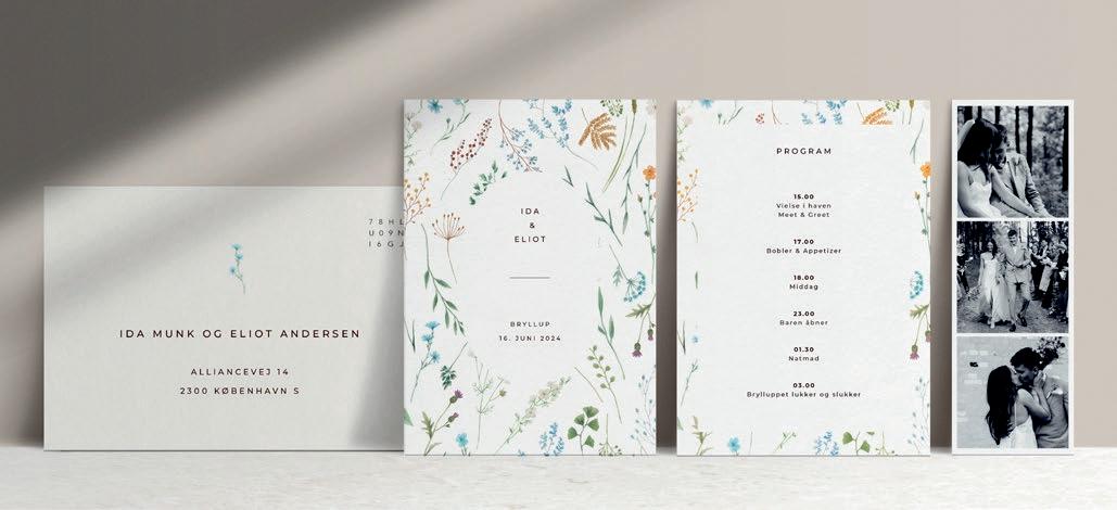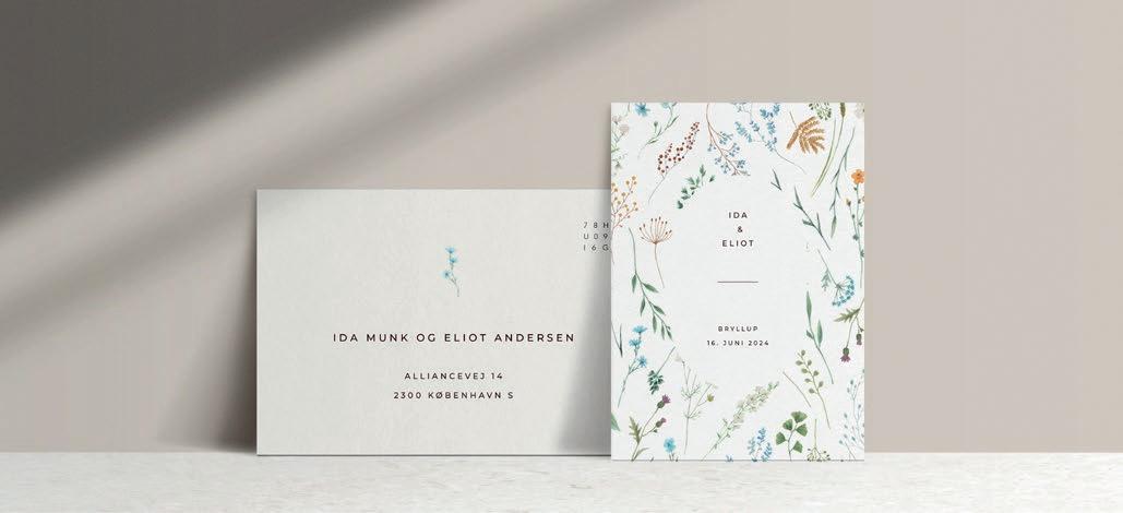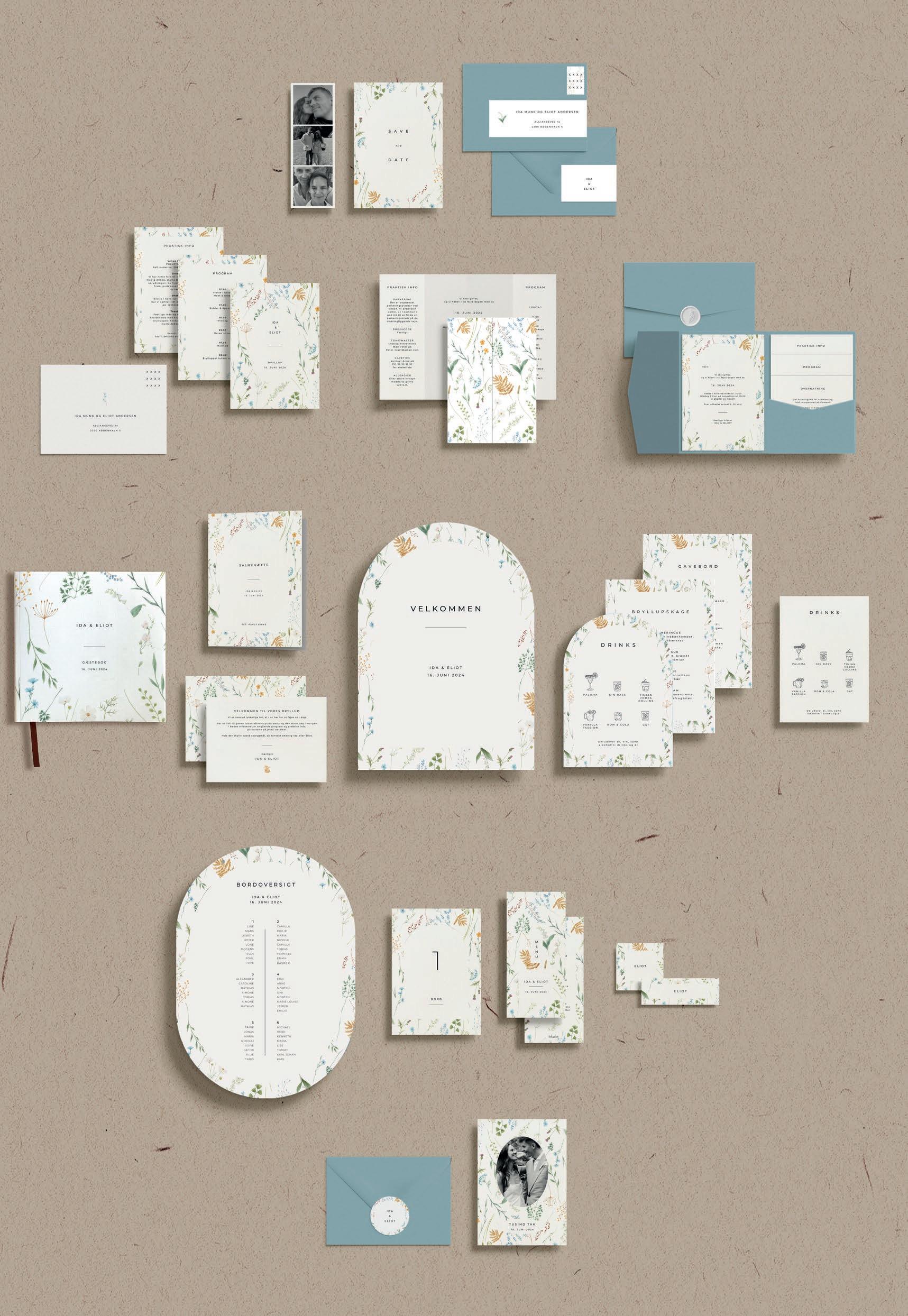Bemærk at samtlige af vores invitationer kan foldes ud til en serie, hvor designet går igen på fx bord-, menukort, bordoversigter, salmehæfter, takkekort mm.