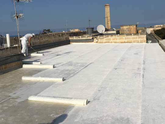 Nowadays, only liquid resin-based waterproofing systems are the most effective solution for protecting flat roofs from the effects of acid rain, sea spray and other environmental factors . These systems are designed to withstand structural movements and can be reinforced with a fiberglass net type MAT 225 when necessary. They also offer resistance to traffic and water stagnation, making them ideal for roofs in Malta. Additionally, thermal versions of resin-based membranes also exit. They can reflect all sunrays and reduce heat intake by up to 90%, providing a more comfortable indoor environment and reducing the need for excess air