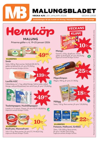 Priserna gäller ons–sön med reservation för ev. slutförsäljning och tryckfel. Lokala avvikelser kan förekomma. Tel. 0280 -125 10, butiken i Malung.