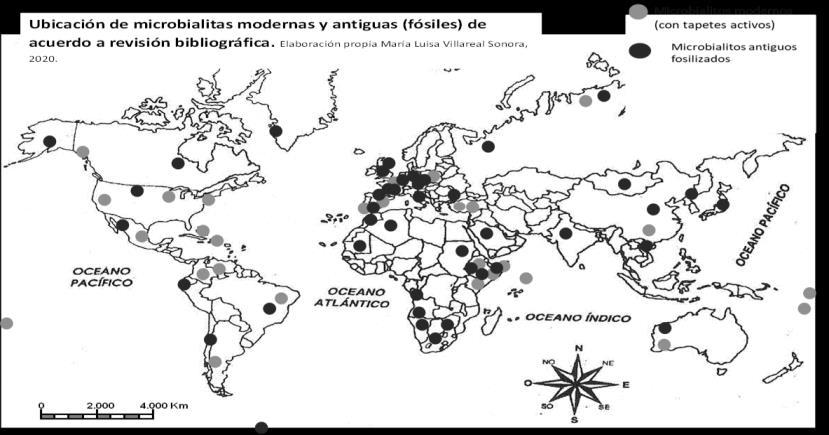 Location of modern and ancient microbials (fossils) according to literature review. Own elaboration. 2020.