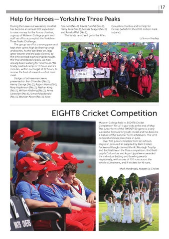 Help for Heroes — Yorkshire Three Peaks During the Leave-out weekend, on what has become an annual CCF expedition to raise money for the Forces charities, a group of Malvern College pupils and staff set off to accomplish the Yorkshire Three Peaks Challenge. The group set off at a strong pace and kept their spirits high by sharing songs and stories. As the day drew on, legs grew wearier and the pace slowed. By the time we had reached Ingleborough, the final and steepest peak, we had already been walking for nine hours. We finally reached camp in 11 hours and 25 minutes, within our target of 12 hours, to receive the best of rewards — a hot roast meal. Badges of achievement were presented to: Ben Chandler (No.5), Henry George (No.2), Rupert Harris (SH), Rory Hopkinson (No.2), Nathan King (No.5), William Kitching (No.2), Anna Llewellyn (No.6), Simon Macdonald (No.5), Wulstan Nixon (No.5), Alice