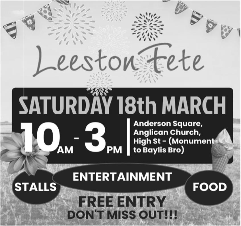 The Leeston Fete for 2023 will be held on March 18th, with free entry. This will be an enjoyable dayoutforthewholefamily.
