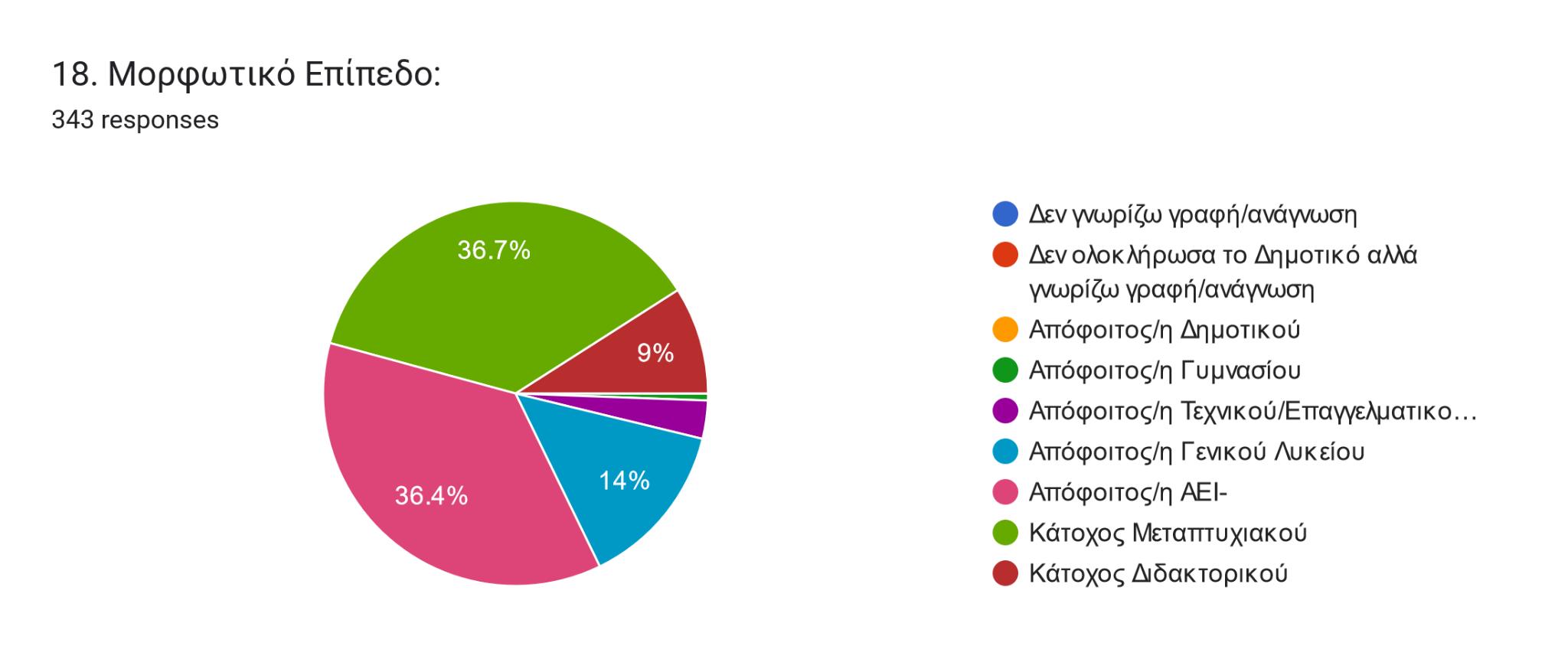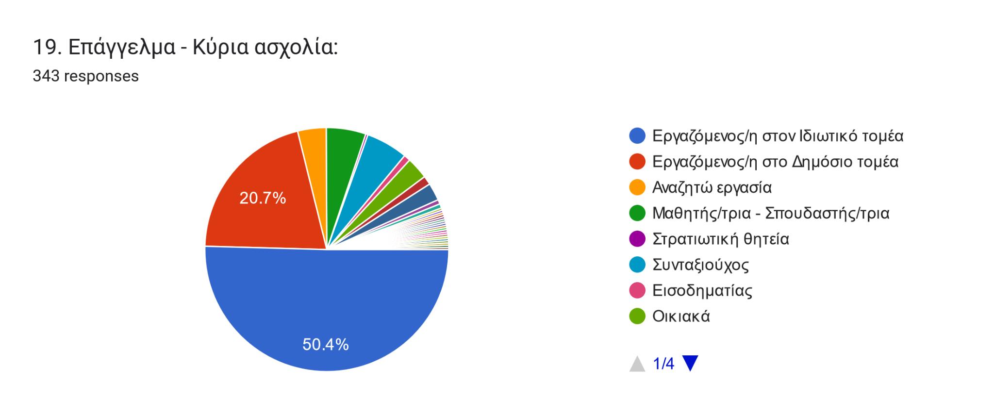 Στο ερώτημα 18 “Μορφωτικό Επίπεδο:” απάντησαν 343 άτομα. 126 απάντησαν Κάτοχος Μεταπτυχιακού“, 125 άτομα απάντησαν “Απόφοιτος/η ΑΕΙ”, 48 “Απόφοιτος/η Γενικού Λυκείου”, 31 “Κάτοχος Διδακτορικού”, 11 “Απόφοιτος/η Τεχνικού/Επαγγελματικού Λυκείου” και 2 άτομα απάντησαν “Απόφοιτος/η Γυμνασίου” Ερώτηση νο19 (πηγή: Google Forms) Στο ερώτημα 19 “Επάγγελμα - Κύρια ασχολία:” απάντησαν 343 άτομα 173 άτομα απάντησαν “Εργάζομαι στον ιδιωτικό φορέα”, 71 άτομα “Εργάζομαι στο Δημόσιο φορέα”, 13 άτομα απάντησαν “Αναζητώ εργασία”, 18 άτομα “Μαθητής/τρια-Σπουδαστής/τρια”, 1 άτομα “Στρατιωτική θητεία”, 19 άτομα “Συνταξιούχος”, 3 άτομα “Εισοδηματίας”, 10 άτομα “Οικιακά”, 4 άτομα “Άνεργος/η”, 18 άτομα