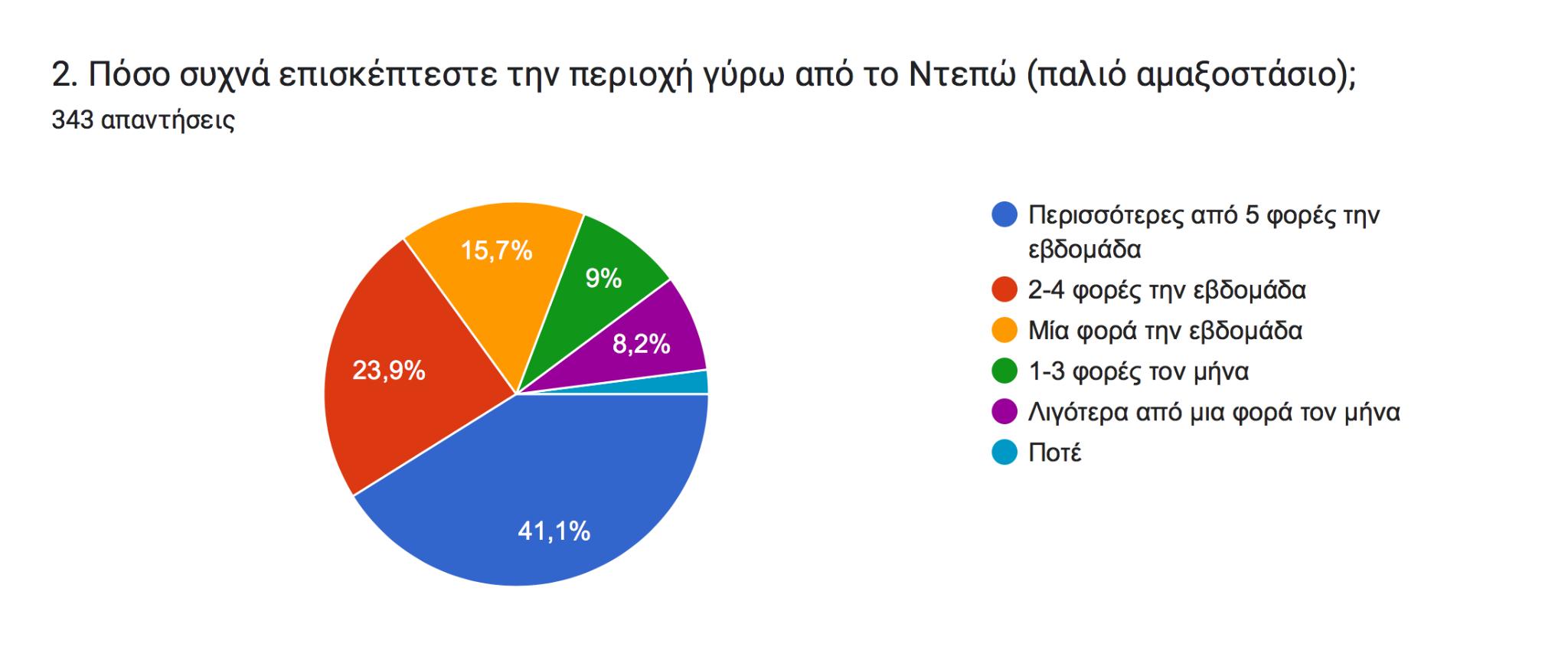 Στο ερώτημα 2 “Πόσο συχνά επισκέπτεστε την περιοχή γύρω από το Ντεπώ (παλιό αμαξοστάσιο);” απάντησαν 343 άτομα, με το 41,1% να δηλώνει ότι επισκέπτεται περισσότερες από 5 φορές την εβδομάδα το παλιό αμαξοστάσιο, το 23,9% δήλωσε ότι επισκέπτεται 2-4 φορές την εβδομάδα, το 15,7% μία φορά την εβδομάδα, το 9% επισκέπτεται 1-3 φορές τον μήνα, 8,2% επισκέπτεται λιγότερο από μια φορά τον μήνα και 2% δεν επισκέπτεται ποτέ την περιοχή. Ερώτηση νο 3 (πηγή: Ιδία επεξεργασία) Στο ερώτημα 3 “Για ποιους λόγους επισκέπτεστε την περιοχή γύρω από το Ντεπώ (παλιό
