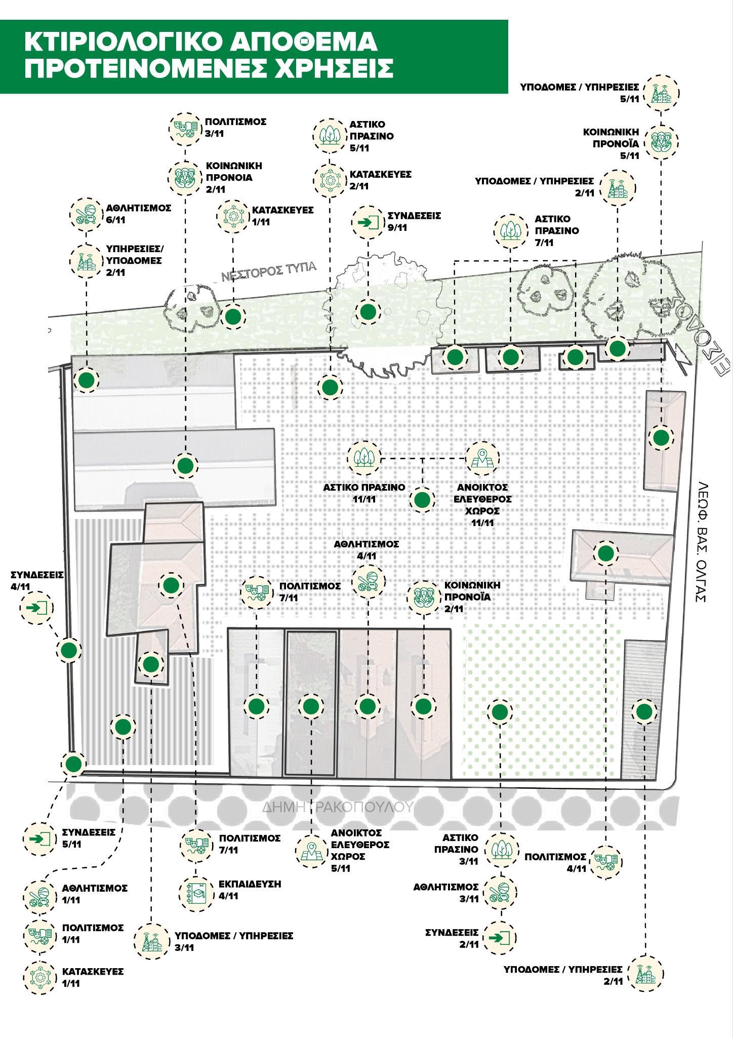 περίπου 50 διαφορετικες κατηγορίες χρήσεων εκ των οποίων τις περισσότερες απαντήσεις συγκέντρωσαν οι "Ποιοτικοί κοινόχρηστοι χώροι" (240 άτομα) και "Πολιτιστικοί χώροι" (230 άτομα) 204 άτομα απάντησαν "Θερινό σινεμά" και 176 "μικρές αθλητικές εγκαταστάσεις".