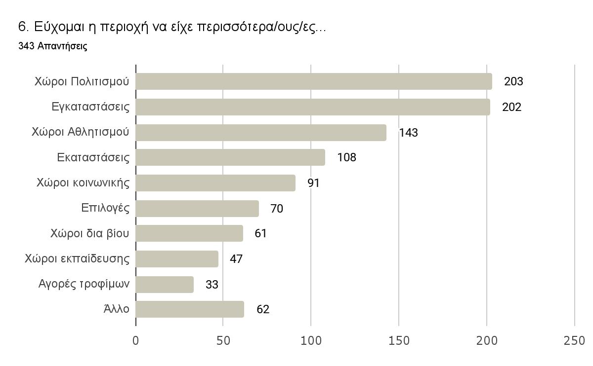 Στο ερώτημα 6 “Εύχομαι η περιοχή να είχε περισσότερα/ους/ες…” απάντησαν 343 άτομα. 203 άτομα απάντησαν “Χώρους Πολιτισμού”, 202 άτομα απάντησαν “Εγκαταστάσεις Αναψυχής”, 143 άτομα απάντησαν “Χώρους Αθλητισμού”, 108 άτομα απάντησαν “Εκαταστάσεις συγκέντρωσης πολιτών, ομάδων, συλλόγων, κλπ”, 91 άτομα απάντησαν “Χώροι κοινωνικής πρόνοιας (παιδικοί σταθμοί, Κέντρα Ανοιχτής Προστασίας Ηλικιωμένων”, 70 άτομα απάντησαν “Επιλογές διασκέδασης”, 61 άτομα απάντησαν “Χώρους δια βίου μάθησης”, 47 άτομα απάντησαν “Χώρους εκπαίδευσης”, 33 άτομα απάντησαν “Αγορές τροφίμων”, 62 άτομα κατέθεσαν απαντήσεις στην κατηγορία “Άλλο” από τις οποίες διακρίνεται η τάση ανάγκης για περισσότερο πράσινο και περιβαλλοντικές υποδομές (χώροι επανάχρησης υλικών), αθλητικές εγκαταστάσεις (skatepark), κοινοτικούς και προσβάσιμους χώρους, παιδικές χαρές, ενώ κατατέθηκε σχόλιο αναφορικά με την απουσία ερώτησης για “Χώρους Πρασίνου”