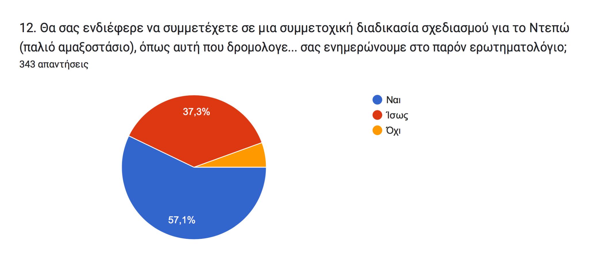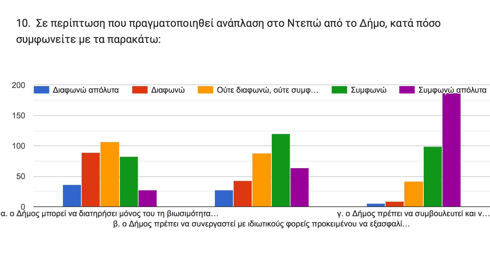 Ερώτηση νο10 (πηγή: Google Forms) Στο ερώτημα 10 “Σε περίπτωση που πραγματοποιηθεί ανάπλαση στο Ντεπώ από το Δήμο, κατά πόσο συμφωνείτε με τα παρακάτω:” απάντησαν 343 άτομα Στη δήλωση α “ο Δήμος μπορεί να διατηρήσει μόνος του τη βιωσιμότητα του εγχειρήματος”, απάντησαν “Συμφωνώ απόλυτα” 28 άτομα, “Συμφωνώ” 83 άτομα, “Ούτε διαφωνώ, ούτε συμφωνώ” 107 άτομα, “Διαφωνώ” 89 άτομα και “Διαφωνώ απόλυτα” 36 άτομα. Στη δήλωση β. “ο Δήμος πρέπει να συνεργαστεί με ιδιωτικούς φορείς προκειμένου να εξασφαλίσει τη βιωσιμότητα του εγχειρήματος” απάντησαν “Συμφωνώ απόλυτα” 64 άτομα, “Συμφωνώ” 120 άτομα, “Ούτε διαφωνώ, ούτε συμφωνώ” 88 άτομα, “Διαφωνώ” 43 άτομα και “Διαφωνώ απόλυτα” 28 άτομα Στη δήλωση γ “ο Δήμος πρέπει να συμβουλευτεί και να συμπεριλάβει πολίτες