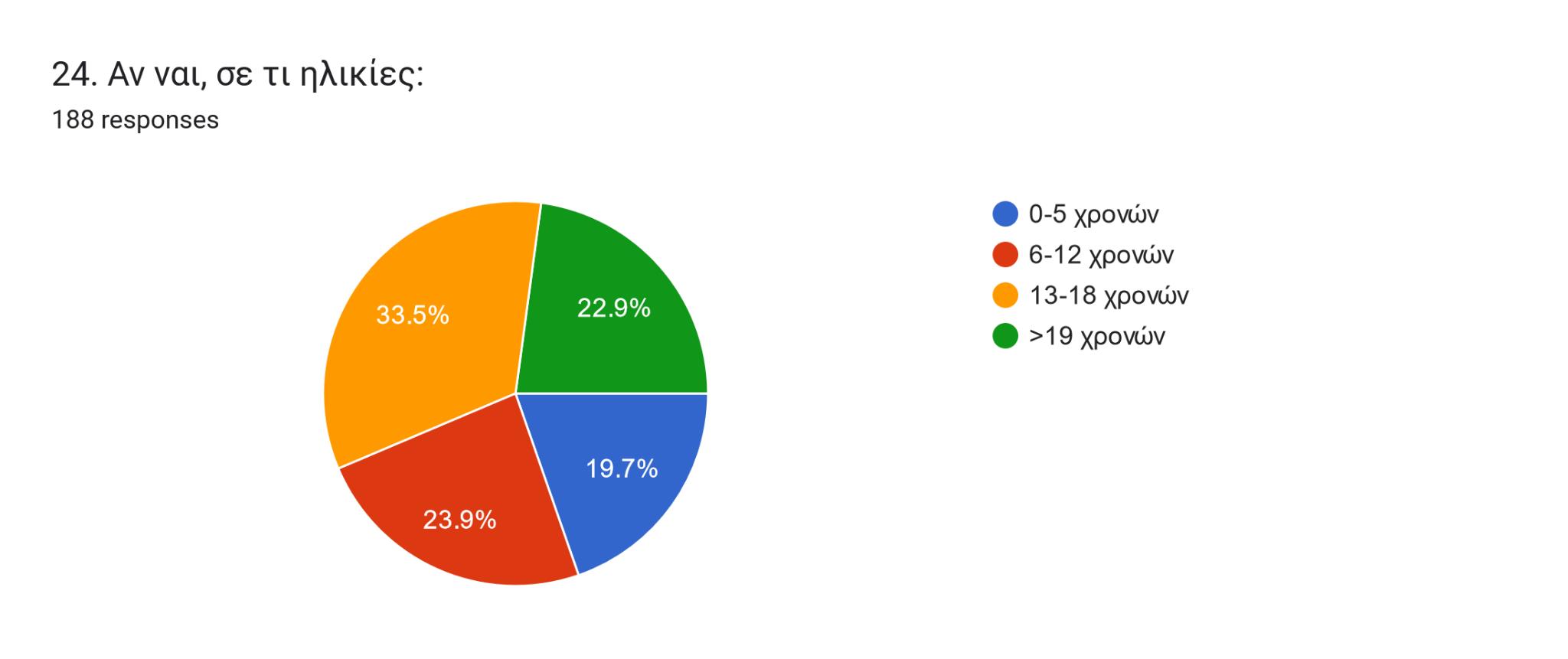 Στο ερώτημα 24 “Αν ναι, σε τι ηλικίες;” απάντησαν 188 άτομα “0-5 χρονών” απάντησαν 37 άτομα, “6-12 χρονών” τα 45, “13-18 χρονών” τα 63 και “>19” τα 43.