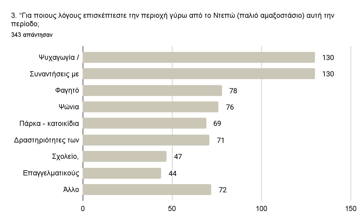 ελεύθερο χρόνο (π χ άθληση, μουσική, χορός κ α )”, 130 απάντησαν πως οι λόγοι επίσκεψης είναι η “Ψυχαγωγία / Διασκέδαση” και “Συναντήσεις με φίλους / οικογένεια”, 78 άτομα απάντησαν “Φαγητό”, 76 άτομα απάντησαν “Ψώνια”, 69 άτομα απάντησαν “Πάρκα - κατοικίδια”, 51 άτομα απάντησαν “Δραστηριότητες των παιδιών μου (π.χ. άθληση, μουσική, χορός κ.α.)”, 47 άτομα απάντησαν “Σχολείο, Φροντιστήρια”, 44 άτομα απάντησαν για “Επαγγελματικούς λόγους”, Στην κατηγορία
