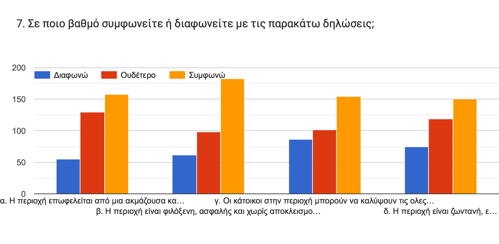 Ερώτηση νο 7 (πηγή: Google Forms) Στο ερώτημα 7 “Σε ποιο βαθμό συμφωνείτε ή διαφωνείτε με τις παρακάτω δηλώσεις;” απάντησαν 343 άτομα Στη δήλωση α “Η περιοχή επωφελείται από μια ακμάζουσα και ευημερούσα οικονομία”, απάντησαν “Συμφωνώ” 158 άτομα, “Ουδέτερο” 130 άτομα και “Διαφωνώ” 55 άτομα Στη δήλωση β “Η περιοχή είναι φιλόξενη, ασφαλής και χωρίς αποκλεισμούς για όλους” απάντησαν “Συμφωνώ” 183 άτομα, “Ουδέτερο” 98 άτομα και “Διαφωνώ” 62 άτομα Στη δήλωση γ “Οι κάτοικοι στην περιοχή μπορούν να καλύψουν τις ολες τους ανάγκες τους σε τοπικό επίπεδο”, απάντησαν “Συμφωνώ” 155 άτομα, “Ουδέτερο” 102 άτομα και “Διαφωνώ” 86 άτομα. Στη δήλωση δ. “Η περιοχή είναι ζωντανή, ελκυστική και περιβαλλοντικά βιώσιμη” , απάντησαν “Συμφωνώ” 150 άτομα, “Ουδέτερο” 119 άτομα και “Διαφωνώ” 74 άτομα.